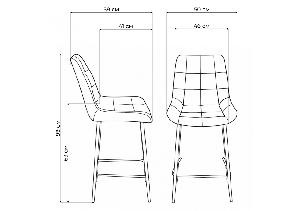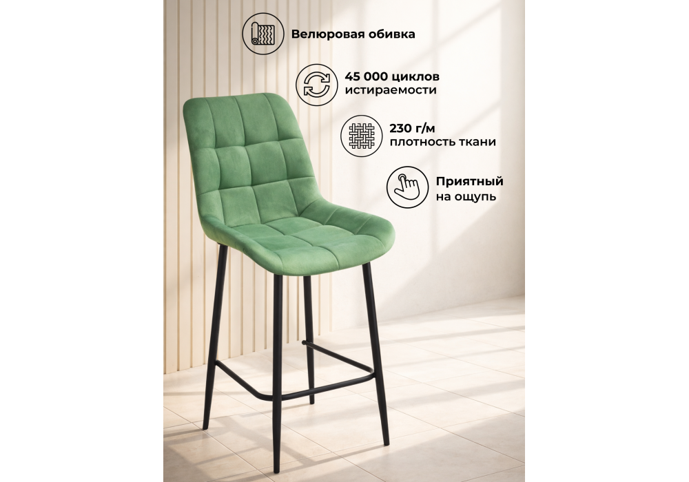 Материал каркаса - металл; Материал сиденья - велюр; Материал обивки - велюр; Цвет ножек - черный; Ширина - 50; Глубина - 58; Высота - 99; Ширина сиденья - 46; Глубина сиденья - 41; Высота сиденья - 63;