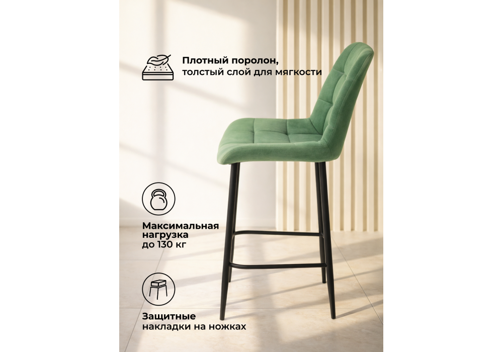 Материал каркаса - металл; Материал сиденья - велюр; Материал обивки - велюр; Цвет ножек - черный; Ширина - 50; Глубина - 58; Высота - 99; Ширина сиденья - 46; Глубина сиденья - 41; Высота сиденья - 63;