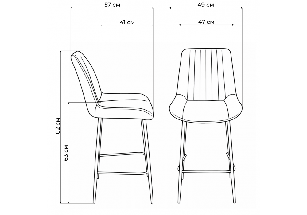 Материал каркаса - металл; Материал сиденья - велюр; Материал обивки - велюр; Цвет ножек - серый; Ширина - 49; Глубина - 57; Высота - 102; Ширина сиденья - 47; Глубина сиденья - 41; Высота сиденья - 63;