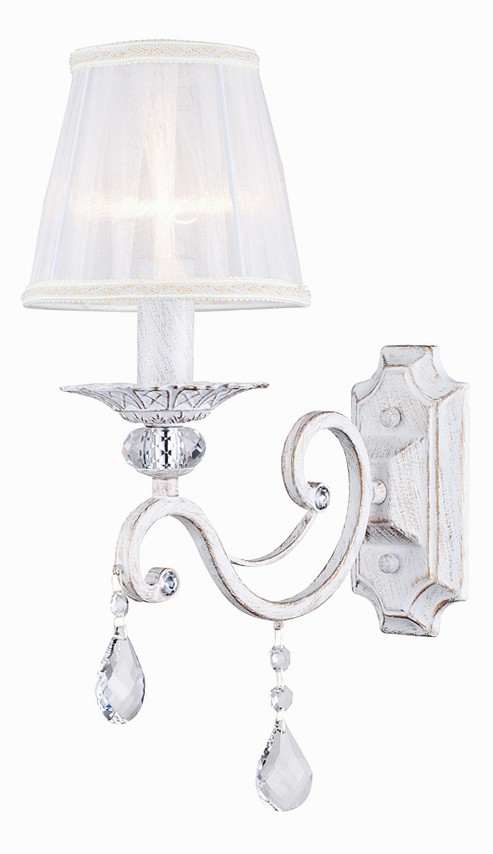 Абажур бра выполнен из белой органзы, а арматура, украшенная хрустальными подвесами и шарами, изготовлена из белого металла. В светильнике предусмотрено одна лампа накаливания с типом цоколя Е14 и мощностью 40 Вт каждая. Общая мощность составляет 40 Вт, что обеспечивает комфортное освещение на площади до 3 квадратных метров. Бра крепится на стену на планку и имеет размеры: ширина — 14 см, высота — 39 см, длина — 28 см. Расширенная гарантия на товар составляет 18 месяцев.