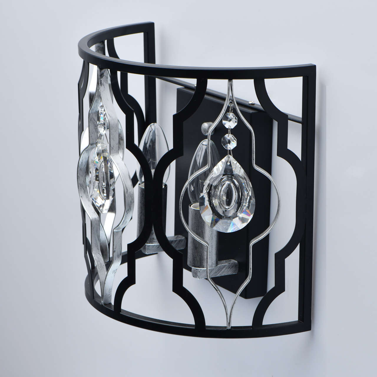 Основание светильника выполнено из металла и окрашено в черный цвет. Декоративные элементы на плафоне окрашены в цвет серебра. Декор из прозрачного хрусталя миндалевидной формы.