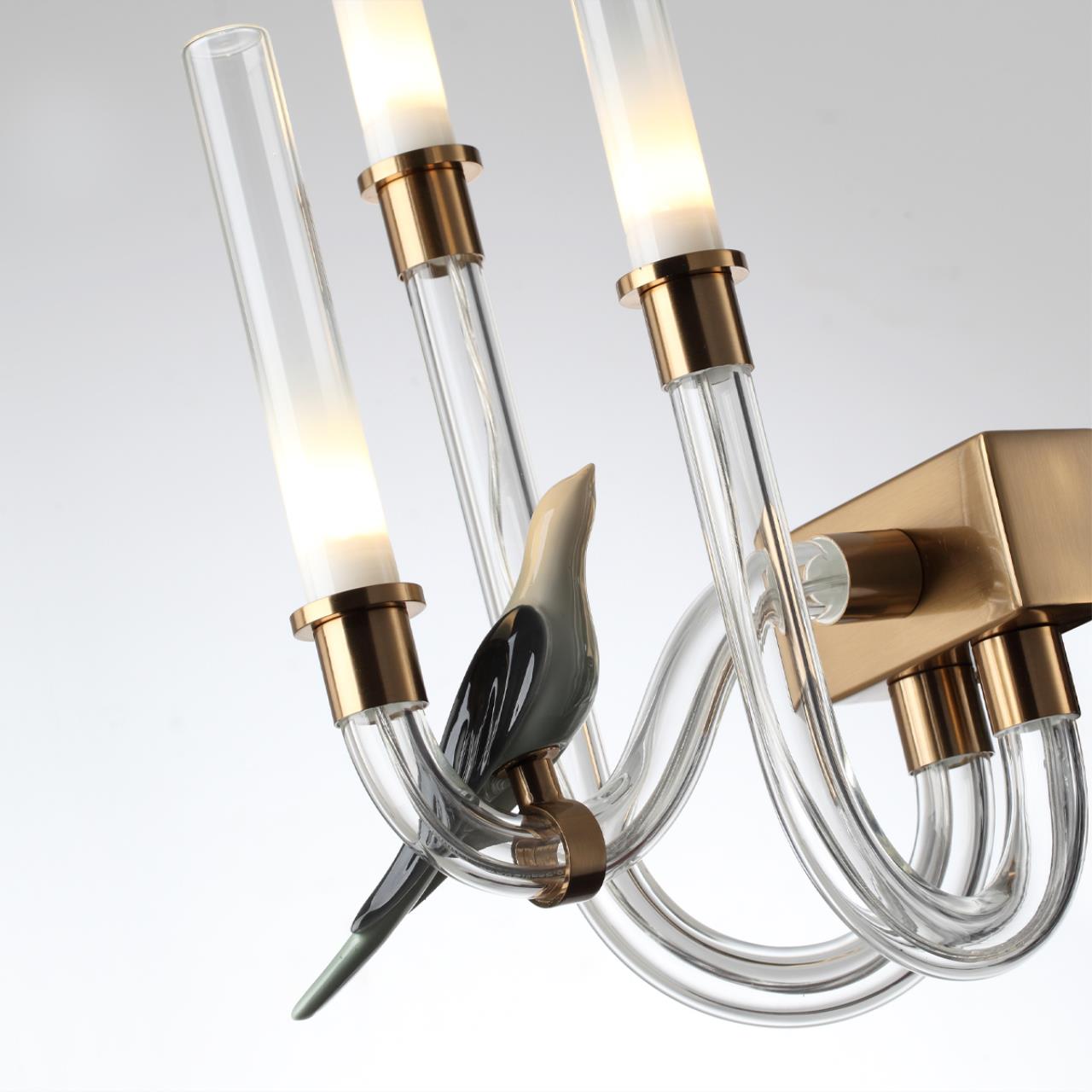 Воздушные светильники линии Lark — это истинный симбиоз природы и предметного дизайна. Изящные птицы из керамики выполнены вручную по авторским эскизам и покрыты глазурью с эффектом градиента. Основная часть (рожки) сделана из прозрачного стекла, благодаря этому светильники Lark будто парят в пространстве. Композицию завершают стеклянные плафоны с градиентом от белого к прозрачному, через которые свет красиво рассеивается и мягко освещает помещение.
