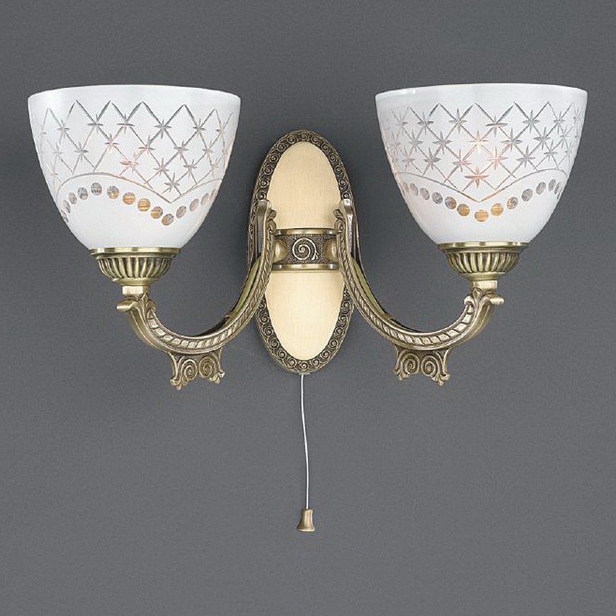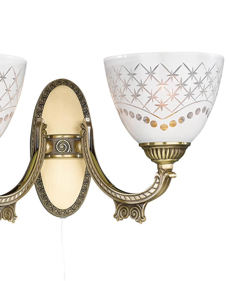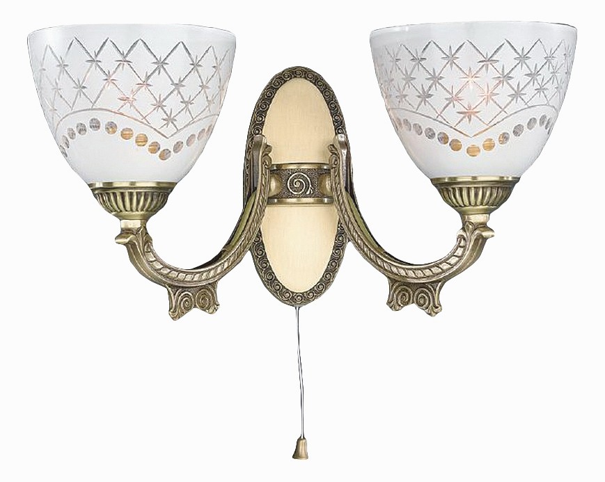 Бра Reccagni Angelo A 7052/2 Итальянского производсва – уникальное сочетание высокого качества и удивительных фактур. Этот светильник Классического стиля хорошо подойдет Для гостиной и придаст помещению мягкий и приятный свет. Плафоны белые из стекла. Арматура бронза из металла. Кол-во ламп - 2шт. Общая мощность 120W