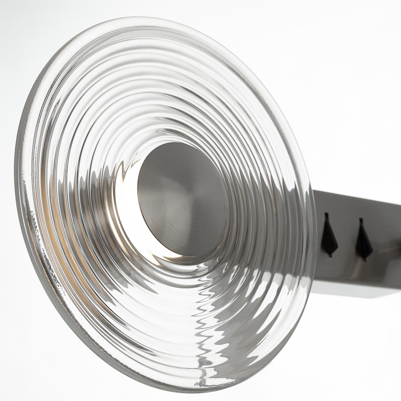 Корпус светильника изготовлен из металлического сплава со стильным хромированным оттенком. Большой круглый плафон — из прозрачного стекла. Благодаря встроенным светодиодам с цветовой температурой 3000К бра светит мягким, равномерным светом без мерцания и пульсаций.