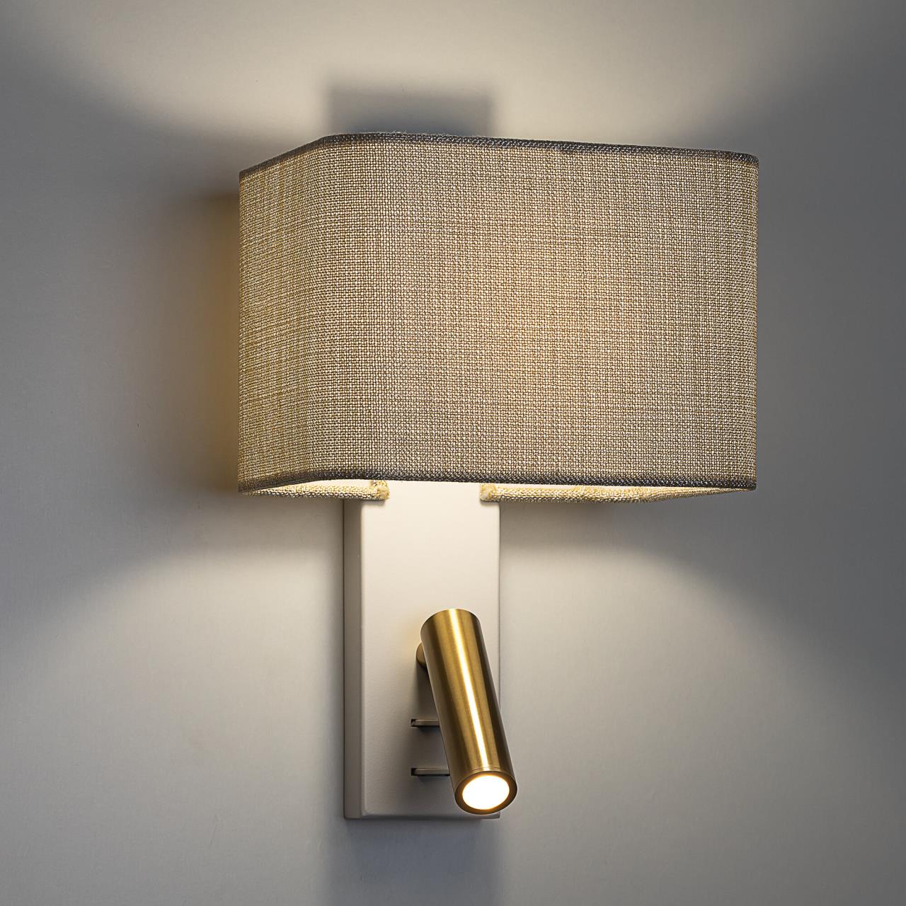 Каркас изделия — металлический, окрашенный матовой белой краской. Абажур квадратной формы — из качественного текстиля бежевого (песочного) оттенка. Кроме того, у светильника есть независимый led-модуль для чтения: с бронзовым корпусом, встроенным светодиодом и поворотным креплением, позволяющим регулировать направление светового потока.