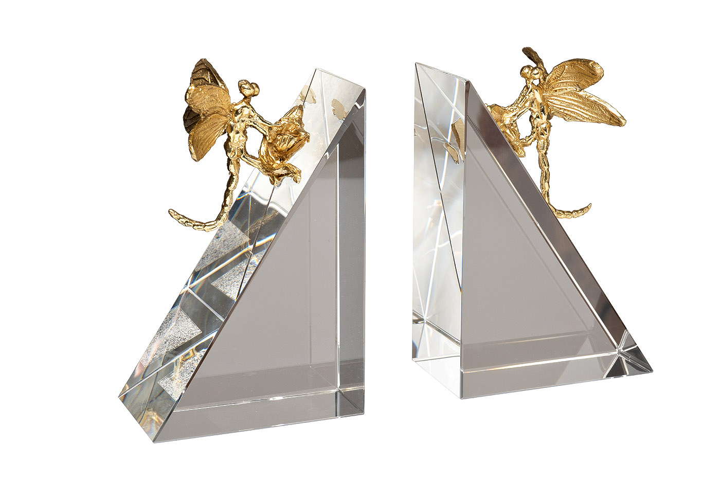 Пара изящных стрекоз украсит ваши полки или книжные шкафы. Гладкие отполированные держатели бережно отнесутся не только к книгам, но и к поверхности ваших полок, в том числе стеклянным и лакированным. Хрустальные основания достаточно тяжелые, чтобы поддержать в вертикальном положении несколько книг или журналов; украшенные золотыми стрекозами, они также служат самостоятельным интерьерным украшением. На востоке и в античном искусстве стрекоза - символ ветра, идиллического спокойствия, легкости бытия и тактического превосходства над соперниками. Согласно учению фэн-шуй, изображения и декор в виде стрекозы приносят вдохновение в делах и помогают оживить отношения, ставшие рутиной.