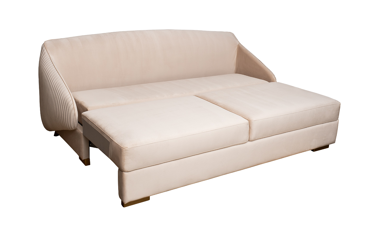 Роскошный диван PALAZZO станет главным украшением гостиной, холла, лаунж-зоны или комнаты для гостей. Он сочетает в себе элегантный дизайн, повышенное удобство и практичность. За счет механизма трансформации «пума» модель легко превращается в комфортное спальное место для двух человек. Эффектный диван бежевого цвета органично вписывается как в темные, так и в светлые современные интерьеры, в стилистику ар-деко, неоклассика, контемпорари, сканди. Диван трехместный раскладной Palazzo 240М, разработка студии GARDA STUDIO. Габариты дивана: длина- 2400мм, глубина- 1050мм, высота- 950мм. Габариты сиденья дивана: длина-1770мм, глубина-550мм, высота- 460мм. Механизм трансформации- ПУМА. Габариты спального места: 2100мм*1360мм. Деревянные опоры, высота 80мм. В стандартном исполнении диван представлен в тканях Романтика 07(основная) и Романтика 07,плисированная ткань(спинка), передние опоры цвет золото. В комплект дивана входят 2 прямоугольные подушки спинки+ и 2 прямоугольные подушки у локтей с эмблемой GD.