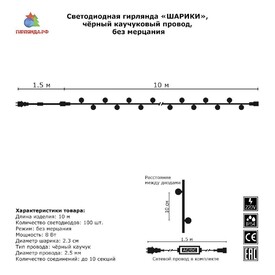 Гирлянда Нить, ШАРИКИ 2.3см., 10м., 100 LED, холодный белый, без мерцания, резиновый черный ПВХ провод. 05-1979