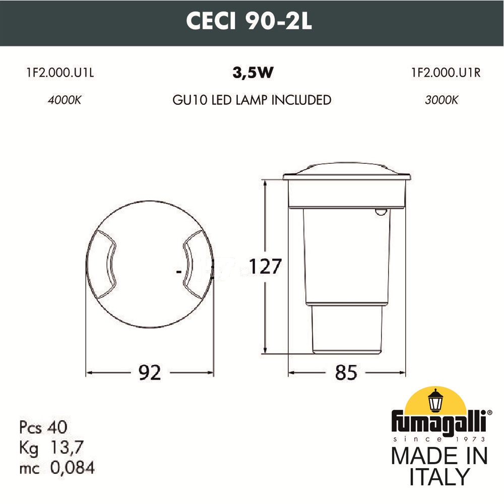 Грунтовые светильники FUMAGALLI серии CECI, модель CECI 90-2L - изготовлены в Италии. Основное предназначение - подсветка снизу фасадов зданий, элементов ландшафта, кустов, деревьев, светового дизайна, освещения парковок и парковых дорожек. Так же может использоваться для декоративного и технического освещения внутри помещений. Устанавливается в дорожное покрытие, полы, отмостку фундаментов зданий, газоны и другие горизонтальные поверхности. Светильник CECI расчитан на сложные условия эксплуатации: на него можно наезжать автомобильным колесом, ходить по нему, светильник не боится льда, воды, механической уборки. Сначала в поверхность монтируется и закрепляется закладной элемент "стакан", в который выводится электрический провод. Далее в данный закладной элемент устанавливается сам уличный светильник CECI и подключается электропитание. Корпус изготовлен из современного вандалостойкого, негорючего полимера RESIN не требующего окраски. Прочного, окрашенного в массе, не ржавеющего и не выгорающего на солнце. Все светильники пыле-влаго защищены по стандарту IP66. Корпус ландшафтного светильника не проводит электричество, относится к 2 классу электробезопасности. Рассеиватель выполнен из антивандального, не мутнеющего и не горючего PMMA. Срок службы светильника - не менее 20 лет. Не требуется трансформатор. Напряжение питания - 220 В. Температура использования от -60 до +90. При заказе требуется выбрать цвет корпуса.