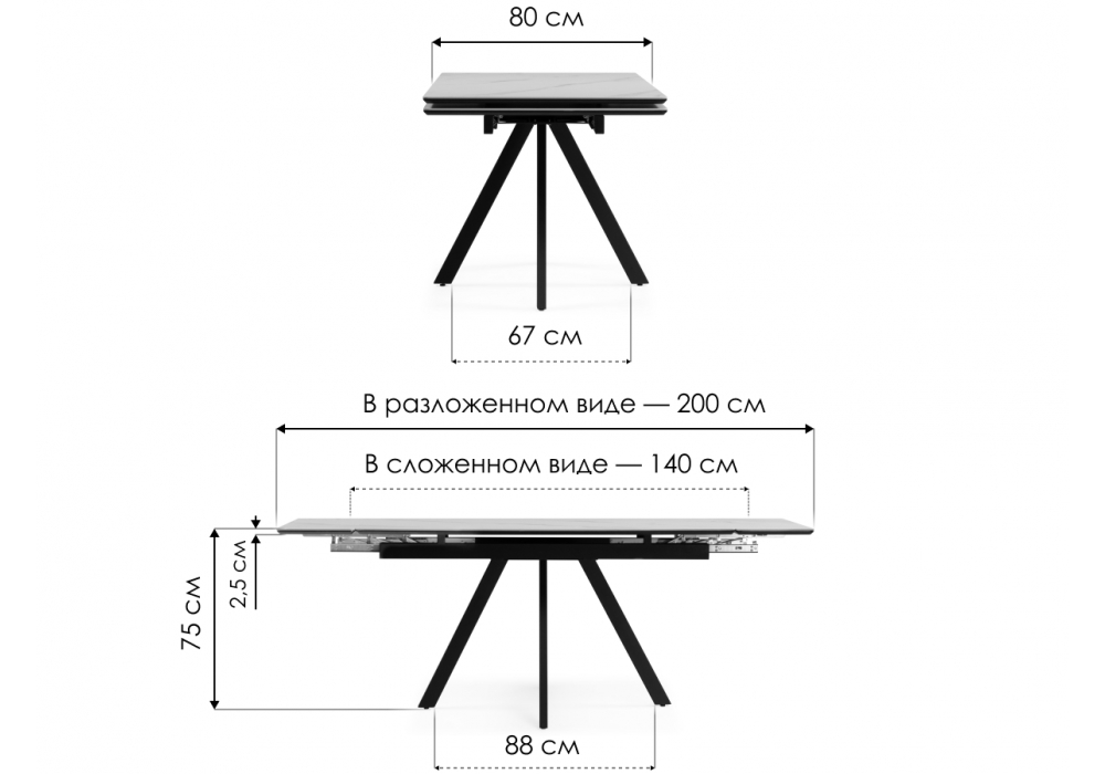 Материал каркаса - металл; Материал столешницы - керамика; Ширина - 80; Высота - 75; Длина стола в разложенном виде - 200; Длина - 140;