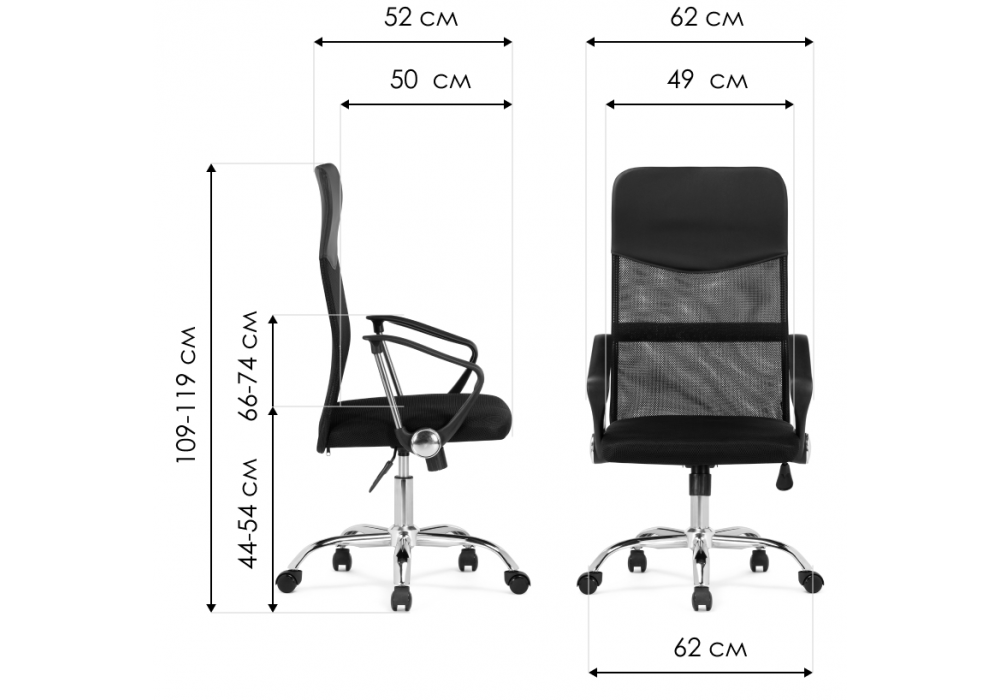 Диаметр крестовины: 62 см. Материал каркаса - Металл; Материал сиденья - Сетка; Материал ножек - Металл; Цвет каркаса - Хромированный металл; Цвет сиденья - Черный; Цвет ножек - Хромированный металл; Цвет обивки - Черный; Ширина - 62; Глубина - 52; Высота - 109; Ширина сиденья - 49; Глубина сиденья - 50; Высота сиденья - 44; Высота сиденья максимальная - 54; Высота максимальная - 119;