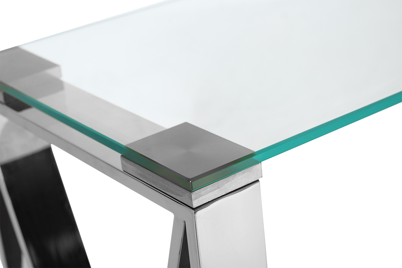 Если вы предпочитаете стиль модерн или нео-классика, то вам понравится представленная консоль в современном стиле. Разработанная талантливыми дизайнерами, эта вещь словно притягивает к себе восхищенные взгляды. Такая консоль со стеклом украсит вашу гостиную или любую другую комнату. Вещь предельно компактная, а прозрачная столешница и тонкие грани металлического основания еще более облегчают конструкцию. Поэтому изделие выглядит практически невесомым и очень изящным. Данная хромированная консоль может быть использована как подставка для разных мелочей – сувениров, фоторамок, засушенных букетов цветов. Однако она вполне красиво смотрится и как самодостаточный предмет интерьера.