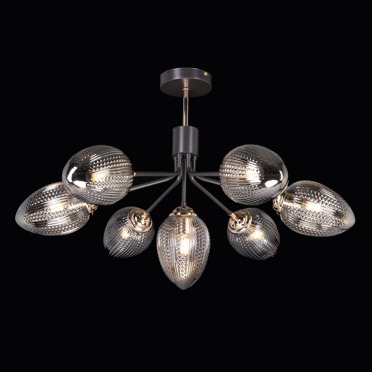 Металлическое основание потолочной люстры окрашено в цвет кофе. Отдельные элементы основания гальванизированы в цвет золота. Плафоны выполнены из фактурного стекла, отлитого в сложную форму и гальванизированного в дымчатый металлизированный цвет.