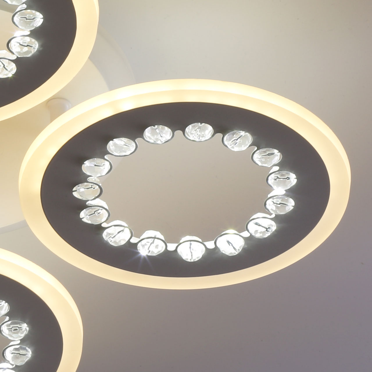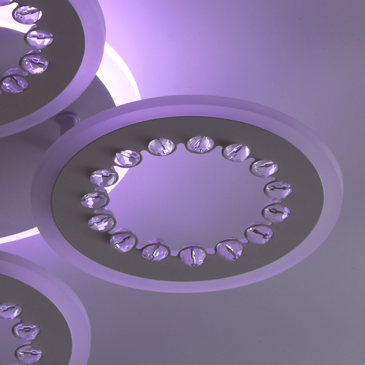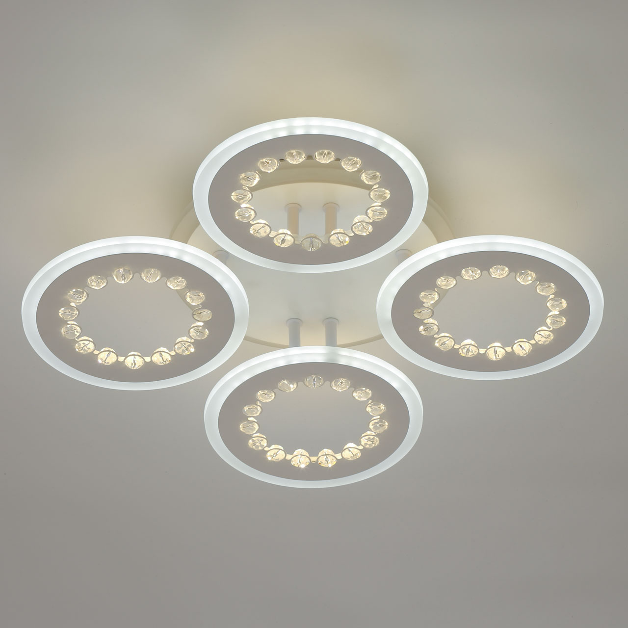 Металлическое основание и плафоны потолочной люстры окрашены в белый цвет. Светодиодные источники света закрыты белым матовым акрилом. Потолочная люстра декорирована бусинами из прозрачного акрила. Дополнительно, в светильнике предусмотрена подсветка потолочной чаши. Светильник приходит в состоянии частичной сборки в компактной упаковке: вся электрика подсоединена, достаточно закрепить плафоны на корпусе.