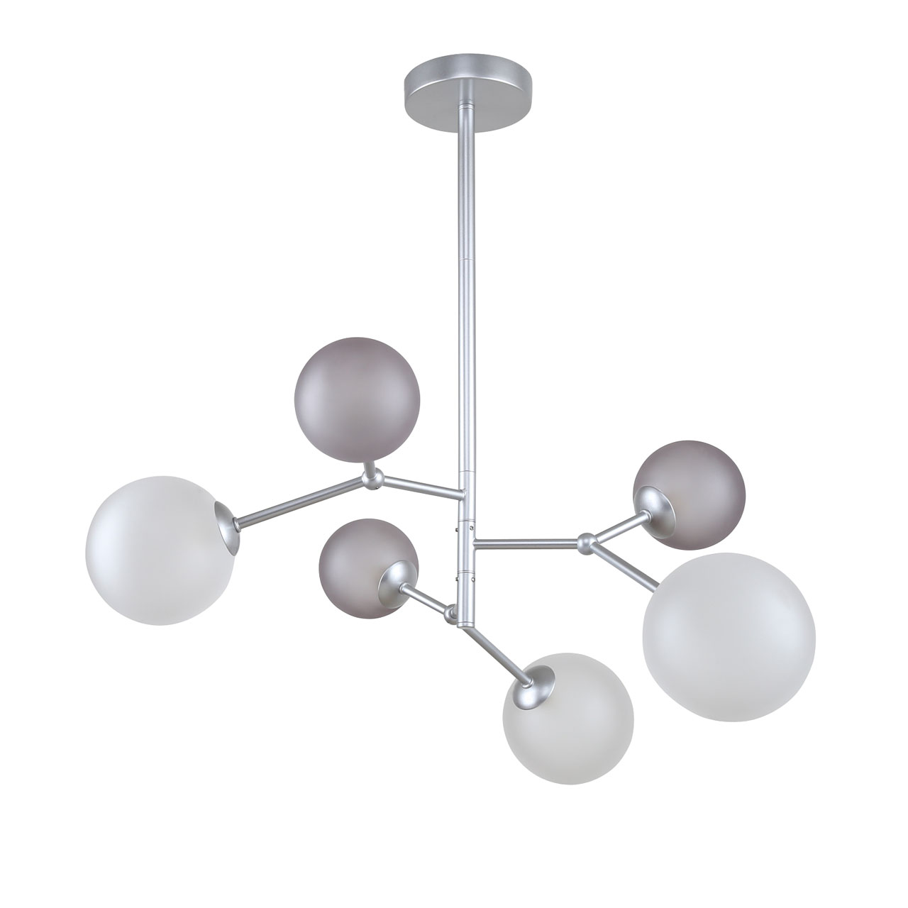Металлическое основание люстры окрашено в цвет перламутрового серебра. Источники света закрыты стеклянными плафонами белого и дымчатого цвета.