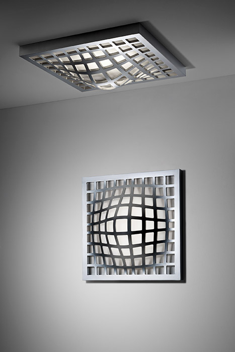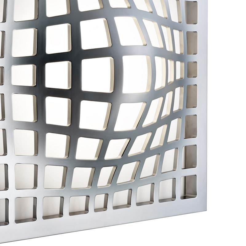 Оригинальный настенно-потолочный светильник KWARK выполнен в виде алюминиевой решетчатой полусферы покрытой блестящим хромом. Исключительность данной модели проявляется в способности создавать иллюзорный эффект объёмной фигуры за счет отражающей способности задней панели светильника.