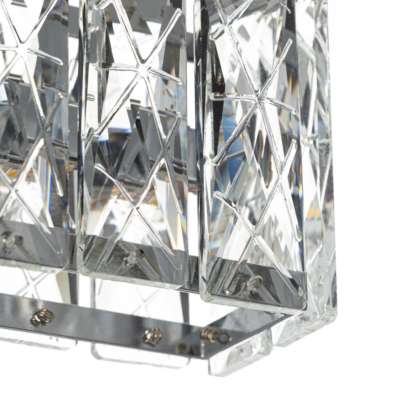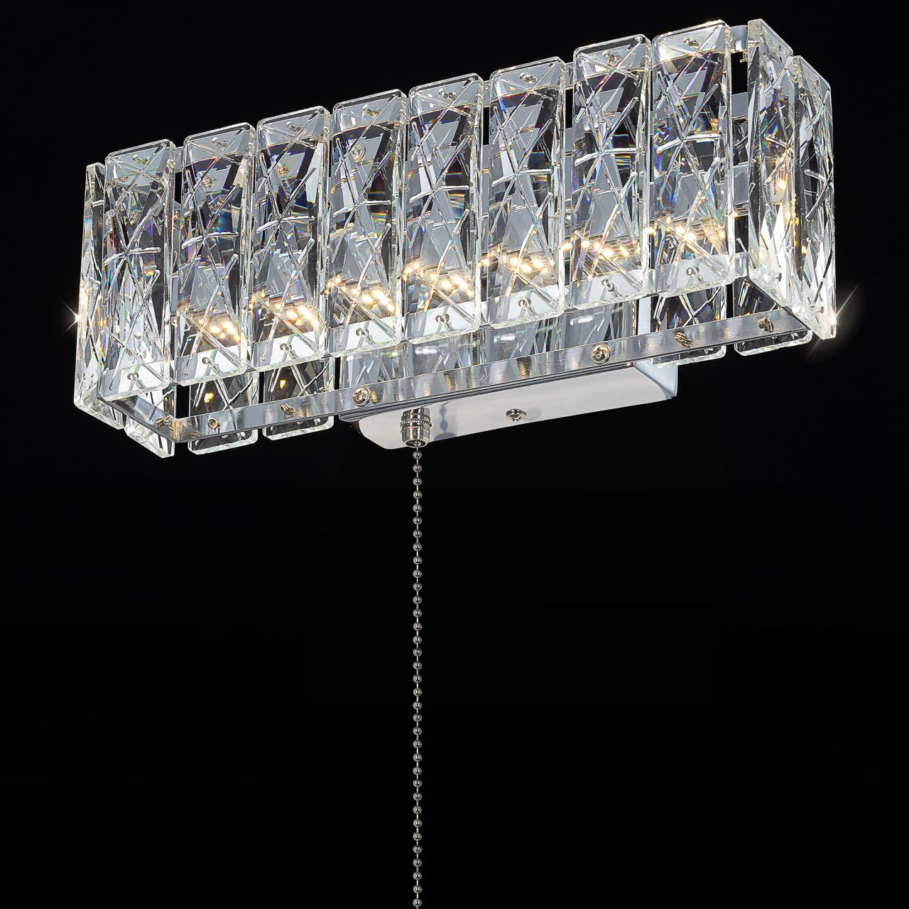 Каркас светильника — металлический, оттенка блестящий хром. На прямоугольном основании закреплен светодиодный прямоугольный модуль с хрустальным рассеивателем. Светодиодный свет с цветовой температурой 3000К мягко рассеивается в пространстве, играя на хрустальных гранях радужными искрами. Мощность бра — 6Вт, удобный выключатель-шнурок расположен на корпусе.