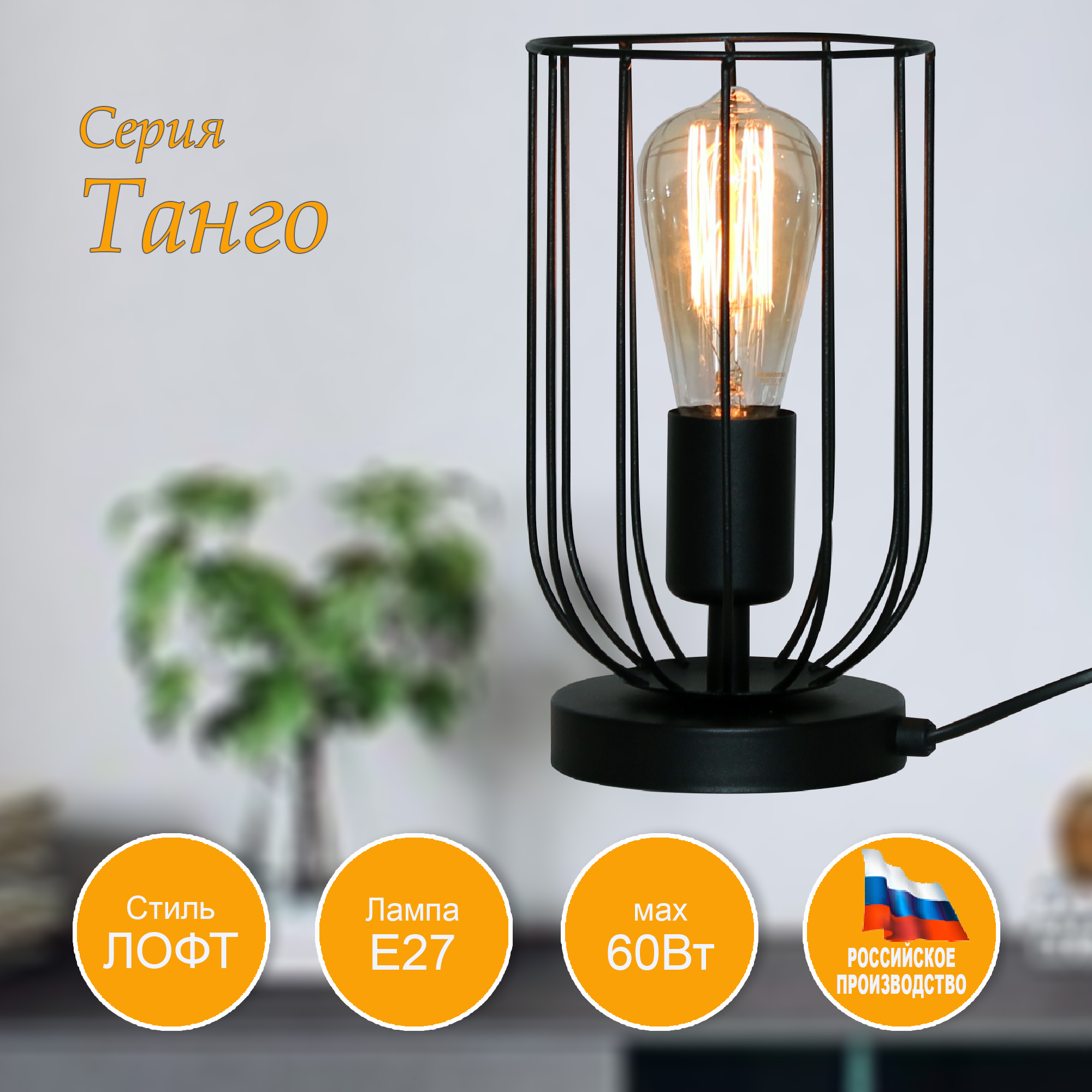 Настольная лампа из коллекции " Танго" со встроенным выключателем отлично подойдет, например, для установки на прикроватные тумбы спальни, оформленной в стиле Лофт и способна эффективно осветить помещение площадью до 3 м2. Плафон светильника изготовлен из металлических прутьев. Для данных светильников могут применяться как стандартные лампы накаливания с цоколем Е27, светодиодные, энергосберегающие КЛЛ, так и светодиодные филаментные. Особое внимание предлагаем обратить на применение в данных светильниках филаментных ламп, их теплый, мягкий свет создаст по-настоящему уютную домашнюю атмосферу. Данную модель 1005405020 можно купить в интернет магазине 220svet.ru