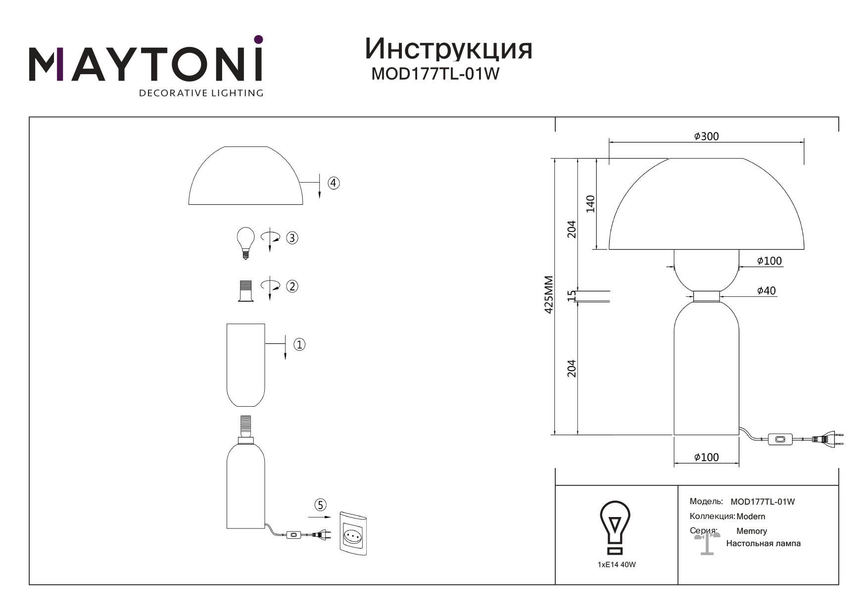 - Мощность лампы: 40 W