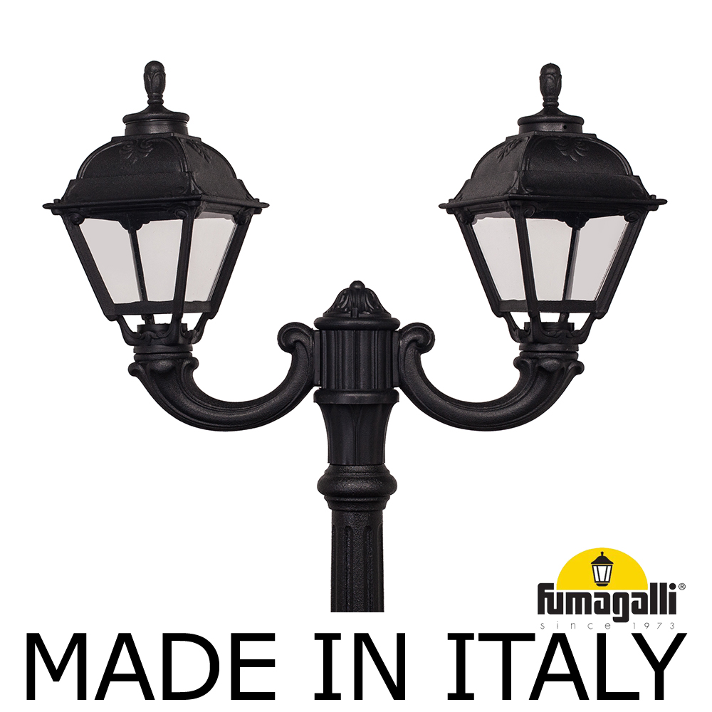 Парковый фонарь FUMAGALLI среднего размера серии CEFA, модель NEBO OFIR/CEFA 2L. Парковый фонарь с 2 светильниками, на консолях OFIR среднего размера, установленных на классическом столбе NEBO высотой 2,5 м (+высота фонарей на кронштейнах). Изготовлены в Италии, по уникальным технологиям "FUMATECH" из современного композитного полимера RESIN. Этот материал в 5 раз прочнее металла, не ржавеет, не окисляется, не выгорает на солнце, его не нужно красить. Все светильники пыле-влаго защищены по стандарту IP55 (Пылезащищенные, защита от водяных струй с любого направления). Рассеиватель выполнен из антивандального, не мутнеющего и не горючего PMMA (ПолиМетилМетаАкрилат). Срок службы светильника - не менее 20 лет. Температура использования от -60 до +90. В серии CEFA есть садовые фонари в настенном (OFIR/CEFA, MIRRA/CEFA) подвесном (SICHEM/CEFA) и наземном исполнении (IAFAET.R/CEFA, ALOE.R/CEFA, ARTU/CEFA, GIGI/CEFA, RICU/CEFA, NEBO/OFIR/CEFA 1L, NEBO/OFIR/ANNA 2L, TABOR/ADAM/CEFA 3L) со столбами разной высоты, с разным количеством и конфигурацией голов. Консоли настенных фонарей и кронштейны светильников на столбах освещения могут устанавливаться в положение вверх и вниз. Столбы выше 150 см имеют в основе мощную стальную трубу с двойной оцинковкой. При заказе требуется выбрать цвет корпуса, цвет плафона и тип патрона (Е-27 или LED GX-53). Возможен светодиодный вариант. По стилю и дизайну серия уличных светильников CEFA похожа на светильники большого размера серии SIMON . По размеру относится к средним парковым светильникам как серия RUT и GLOBE 300.