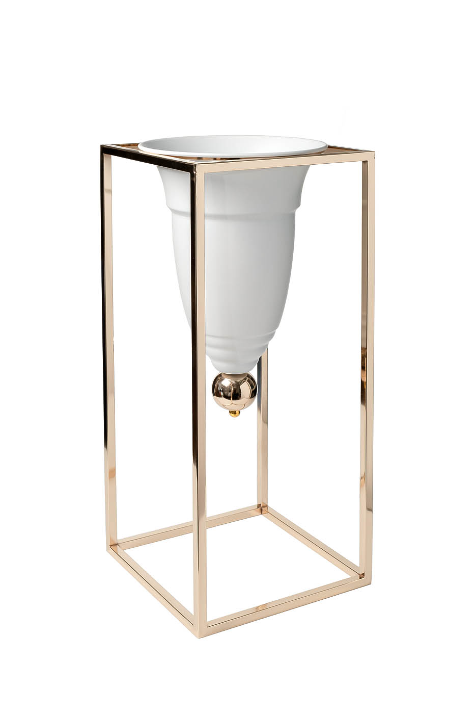 Дизайнерское кашпо на подставке поможет расставить нужные акценты, подчеркнет оригинальность фито-композиции и оживит собой атмосферу. У него отсутствуют дренажные отверстия для стока лишней воды, поэтому ему отведена функция декоративной подставки с эстетической нагрузкой. Его можно разместить в гостиной, столовой, спальне, прихожей. Красивое кашпо на металлической подставке подойдет для живых растений в горшках и композиций из искусственных цветов. Белый цвет выглядит особенно нарядно в сочетании с зеленью. Данное кашпо станет красивым подарком и эффектным украшением интерьера.