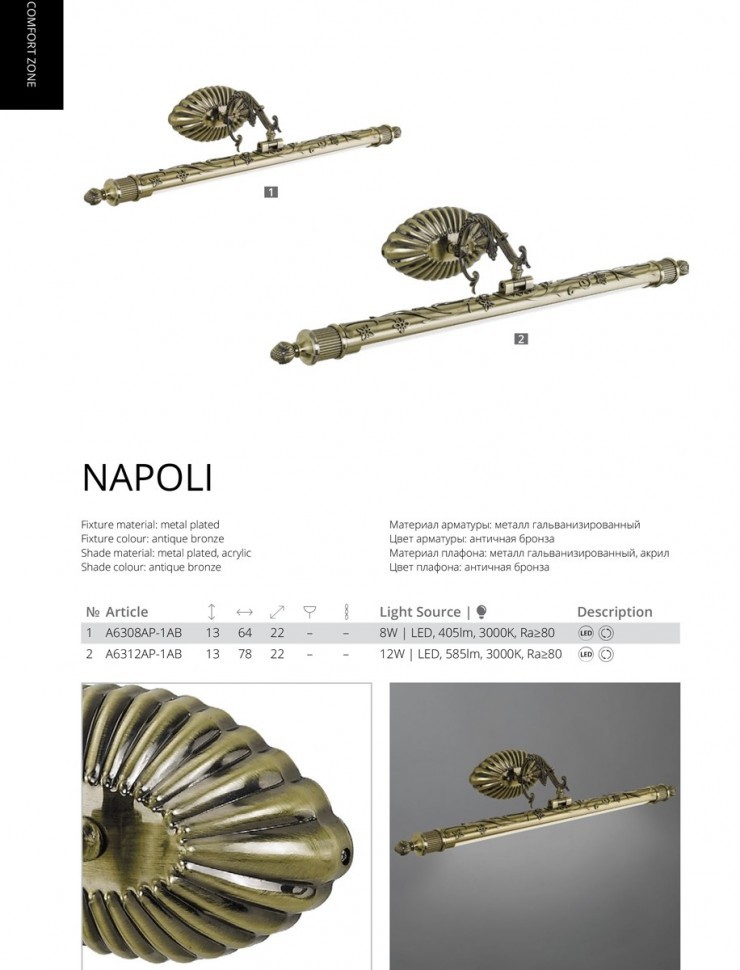 Подсветка для картин Arte Lamp A6312AP-1AB, входящая в серию Napoli, отлично подойдет для освещения пространства над зеркалом или картиной на кухне, на даче, в гардеробной, в прихожей, в кабинете, оформленных в классическом стиле или в стиле Флористика. Данный спот имеет один металлический бронзовый плафон, выполненный в форме цилиндра и направленный вниз, вверх или в стороны, в зависимости от расположения на стене, оснащенный поворотным механизмом, и матовым белым рассеивателем, а также фактурную арматуру в цвете античная бронза, изготовленную из гальванизированного металла. Итальянский производитель Arte Lamp дает гарантию на свое изделие 1 год и обращает внимание на то, что осветительный элемент с цоколем LED встроен в конструкцию и не требует приобретения дополнительных лампочек, а общая мощность светильника составляет 12 Вт, что эквивалентно лампе накаливания мощностью 50 Вт и позволяет осветить помещение площадью 2 кв. м. Общий световой поток составляет 585 Лм, а индекс цветопередачи равен 80 Ra. Технической особенностью этого осветительного прибора является наличие поворотного плафона. Цветовая температура равна 3000 К, что делает атмосферу в вашем интерьере более уютной. Способ крепления подсветки к стене на планку позволяет быстро и просто осуществить монтаж светильника. Классический дизайн, фактурная поверхность античной бронзы и теплая цветовая температура подсветки для картин Arte Lamp A6312AP-1AB, делают ее особенным элементом декора, который украсит любое интерьерное пространство.