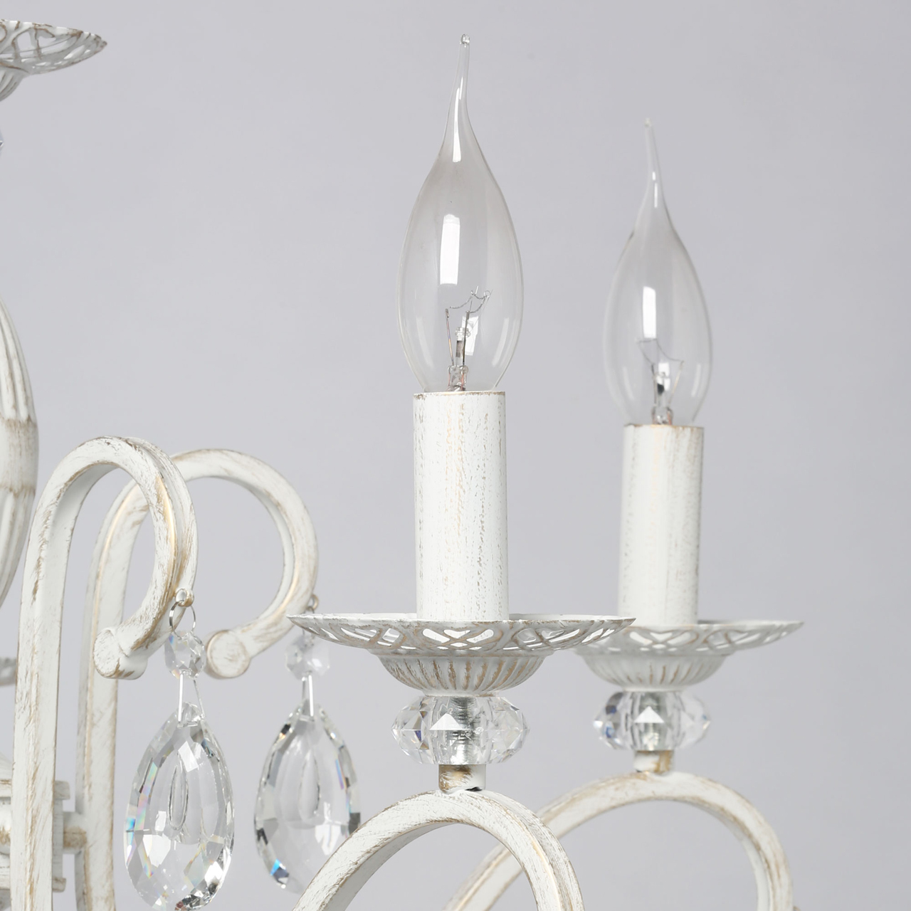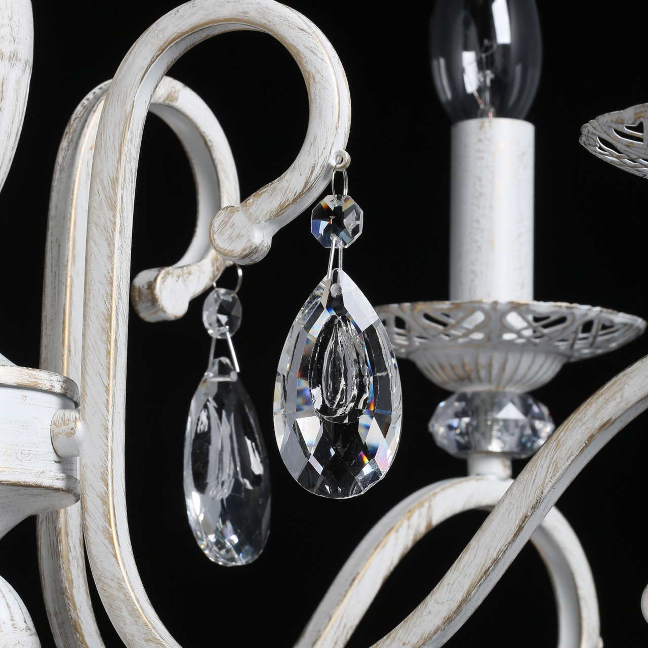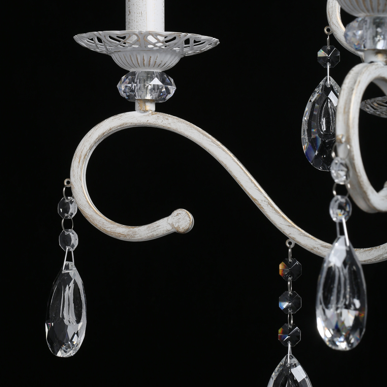 Классическая форма рожков-свечей с наборным основанием белого цвета с золотистой патиной.Оригинальная огранка хрустальных подвесок.Декор рожков с резными розетками придает легкости конструкцииВозможность регулировать высоту светильника, убирая лишние звенья цепи