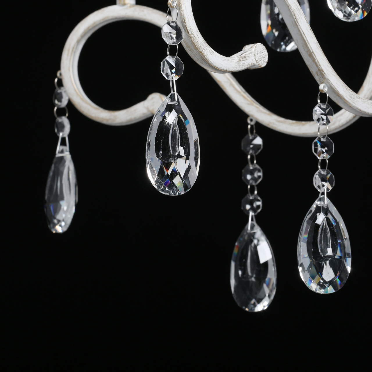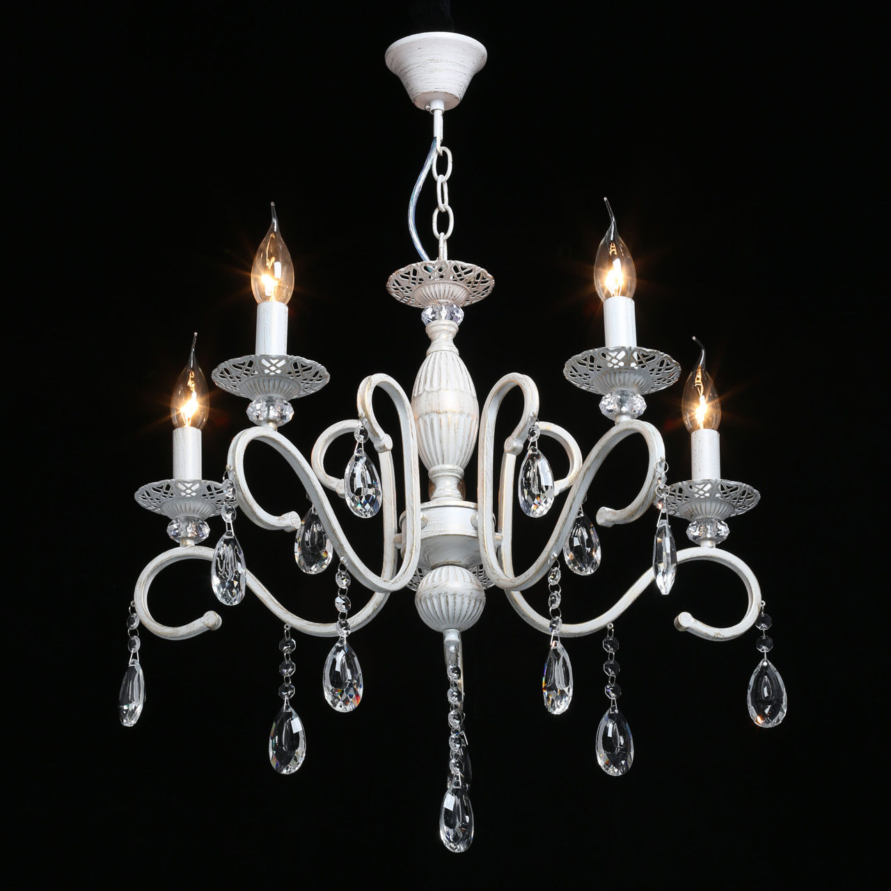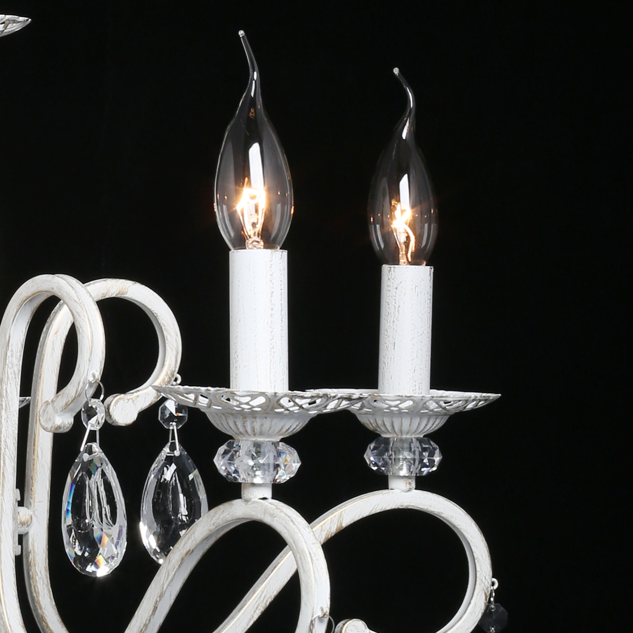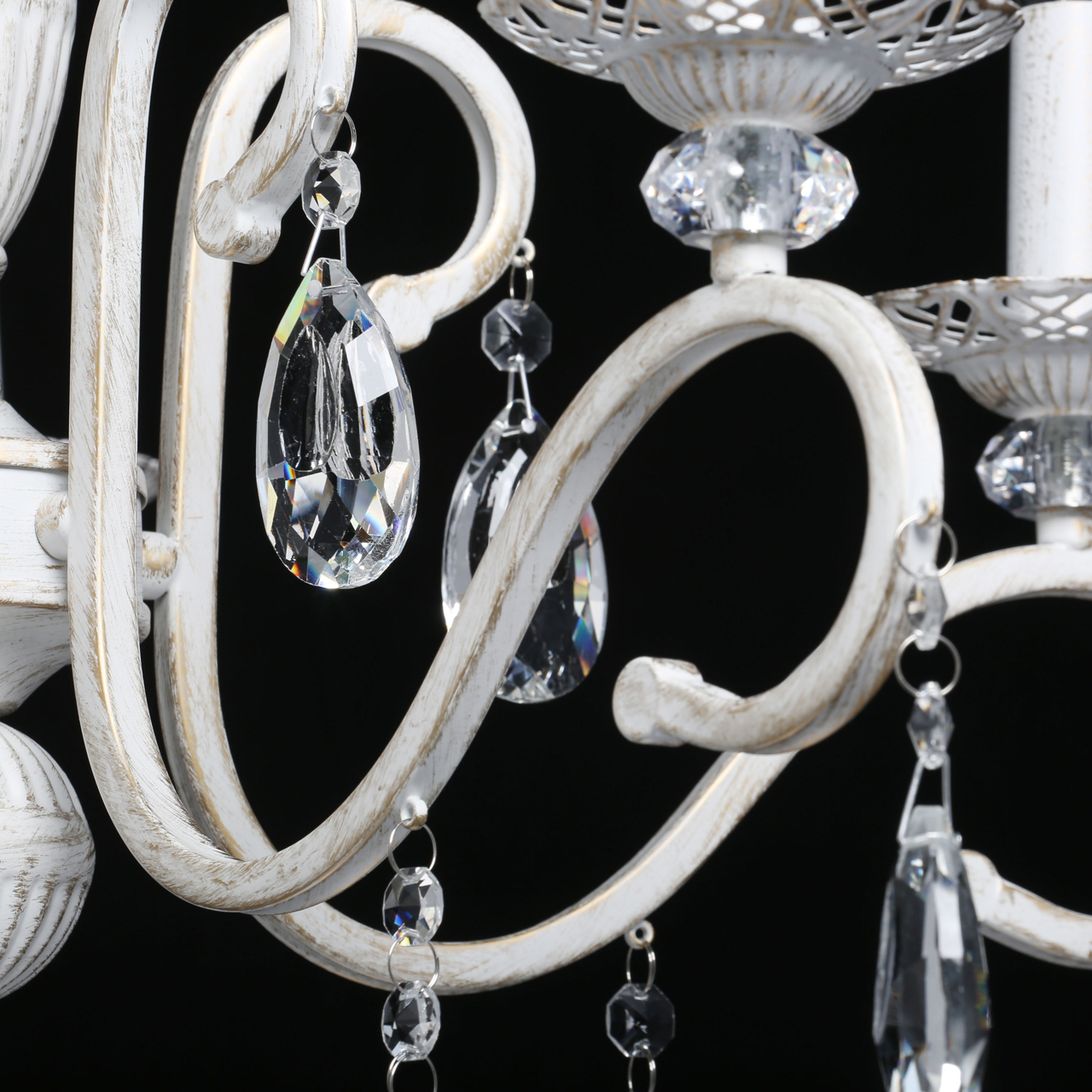 Классическая форма рожков-свечей с наборным основанием белого цвета с золотистой патиной.Оригинальная огранка хрустальных подвесок.Декор рожков с резными розетками придает легкости конструкцииВозможность регулировать высоту светильника, убирая лишние звенья цепи
