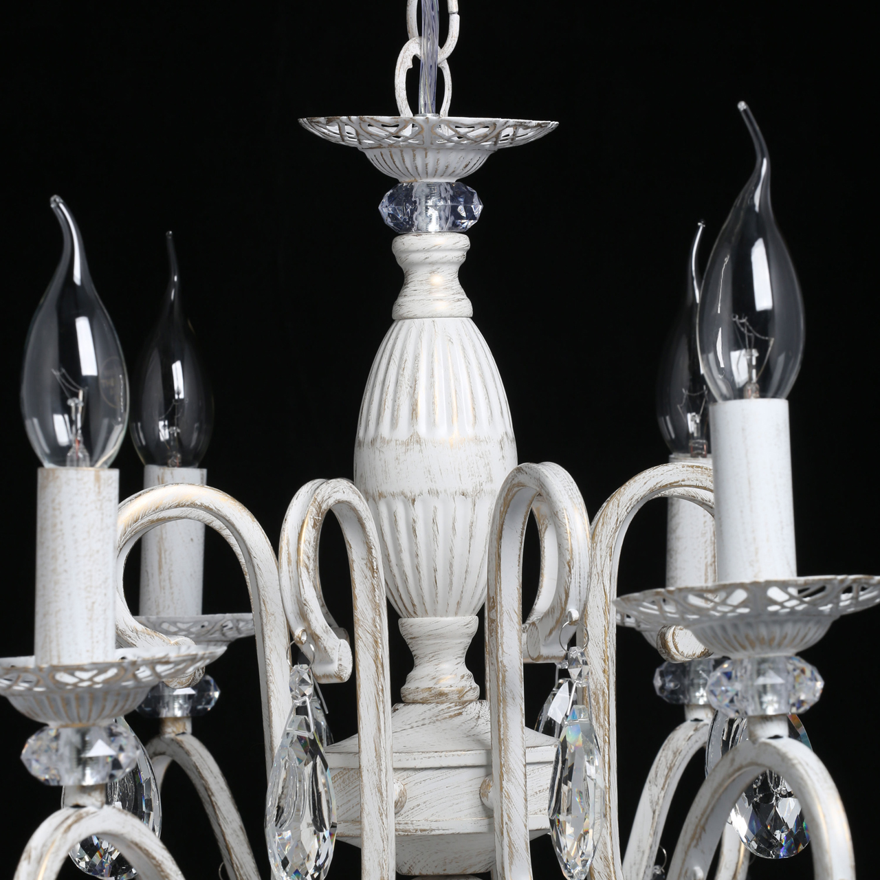 Основание светильника выполнено из металла и обработано по технологии хай-лайт, где основной слой белого цвета, а декоративный слой золотого цвета. Светильник декорирован прозрачным хрусталем. Под декоративными розетками декор из прозрачного акрила.