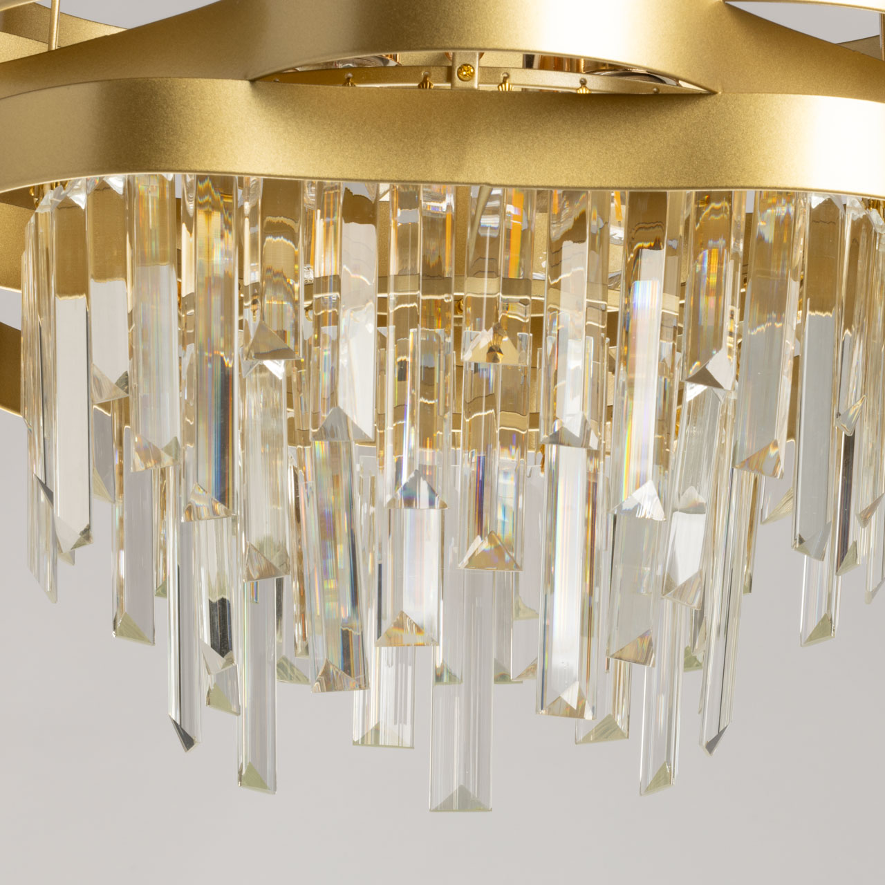 Металлическое основание подвесной люстры гальванизировано в цвет золота. Плафон выполнен из металлических волнистых элементов, окрашенных в цвет перламутрового золота. Люстра декорирована прозрачным хрусталем прямоугольной формы.