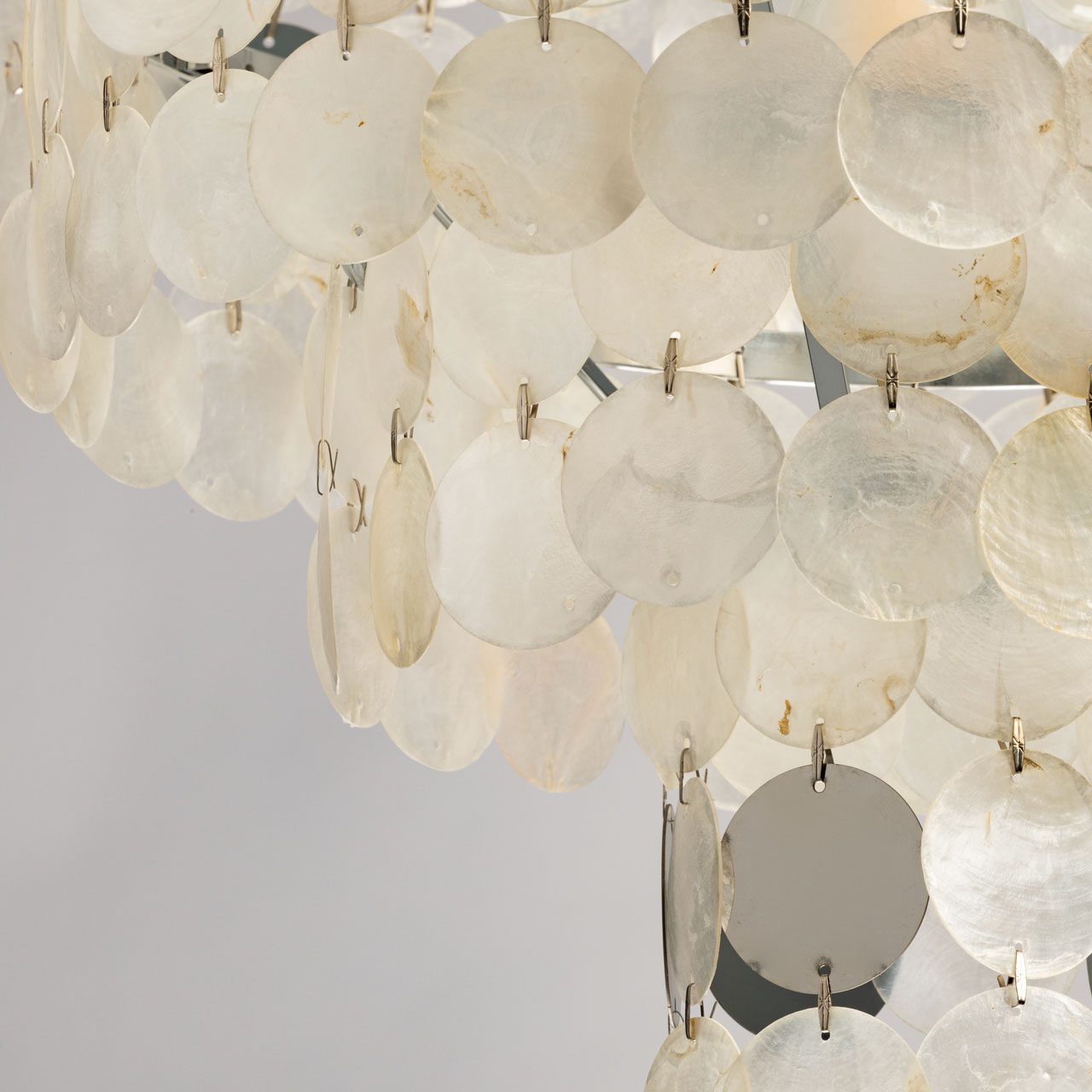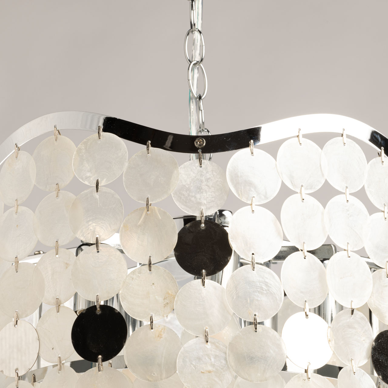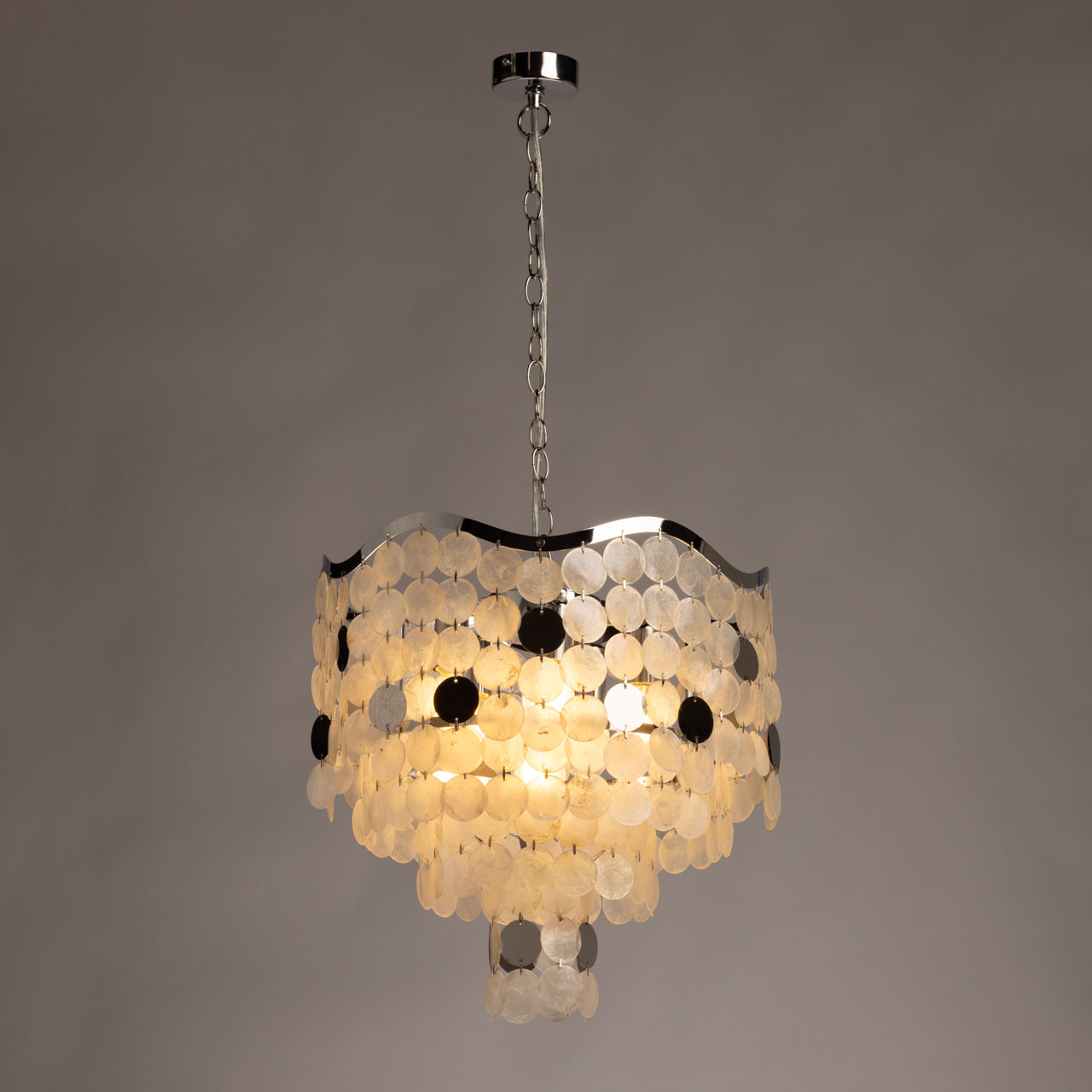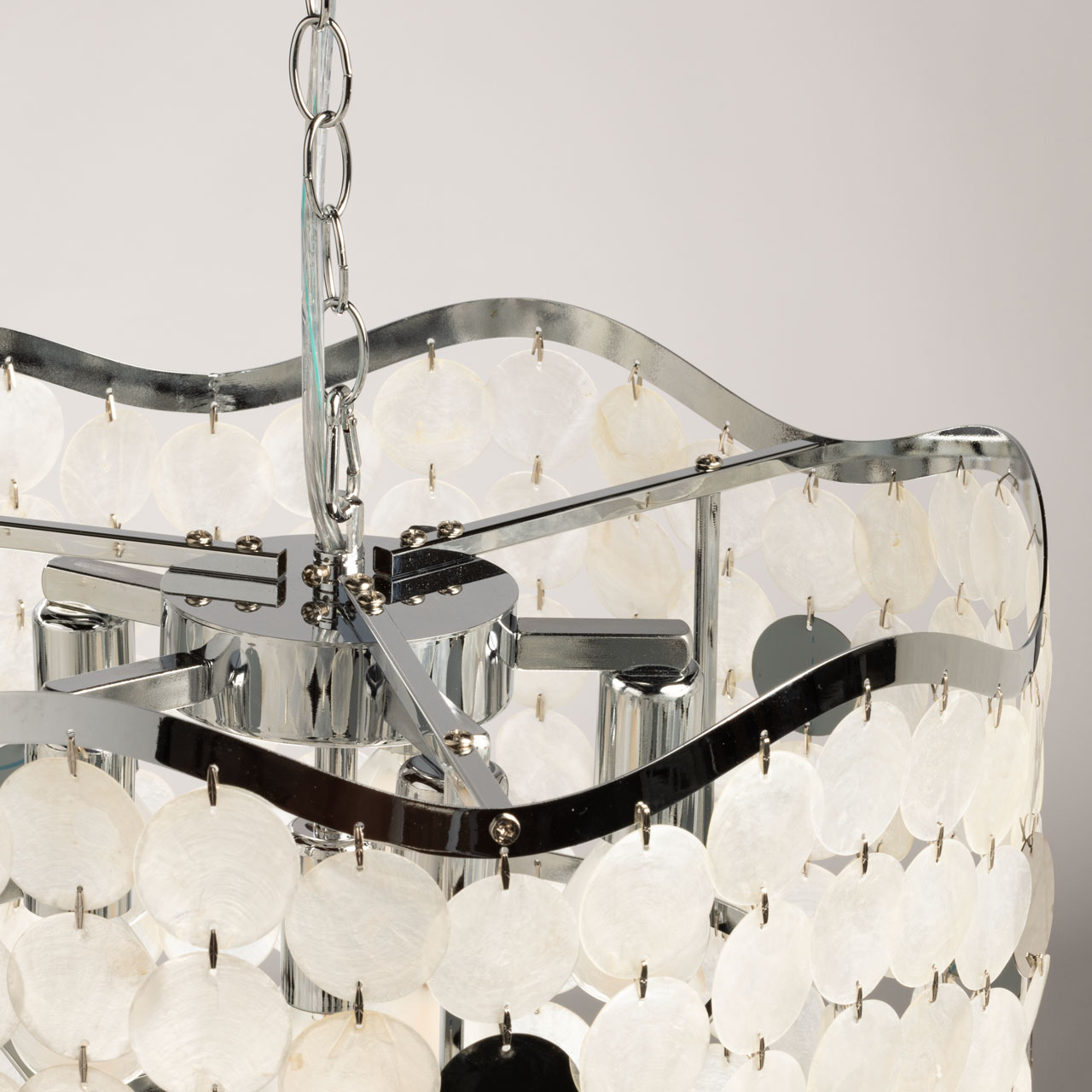 Металлическое основание подвесной люстры гальванизировано в цвет хрома. Люстра декорирована фактурными стеклянными пластинами цвета ракушек.