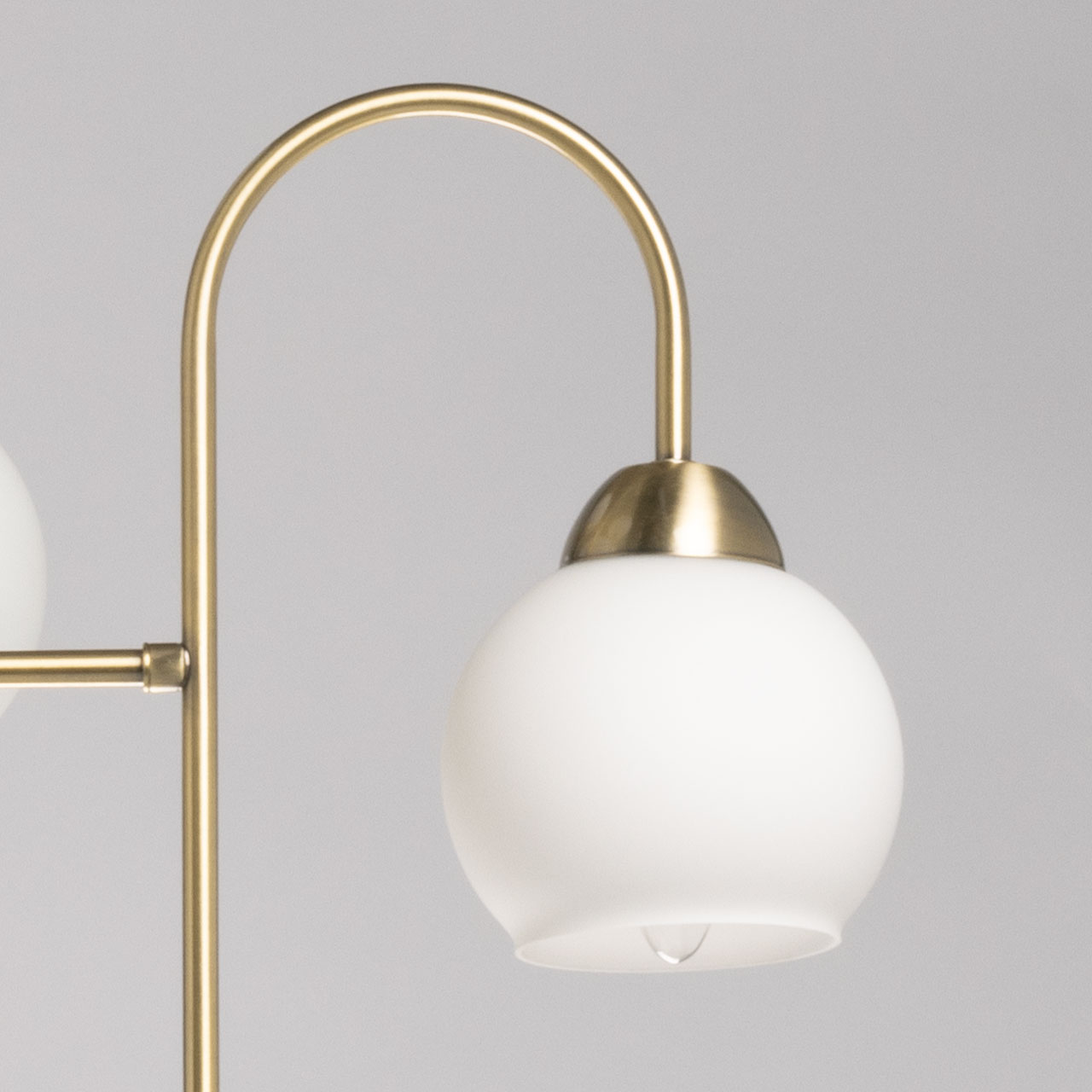 Металлическое основание подвесной люстры гальванизировано в цвет латуни. Люстра декорирована стеклянными матированными плафонами.
