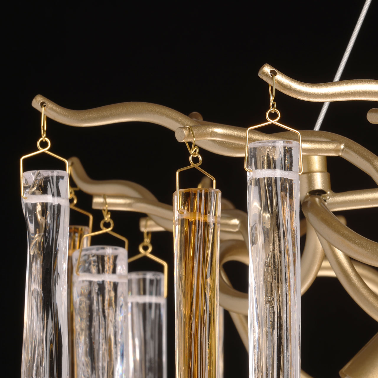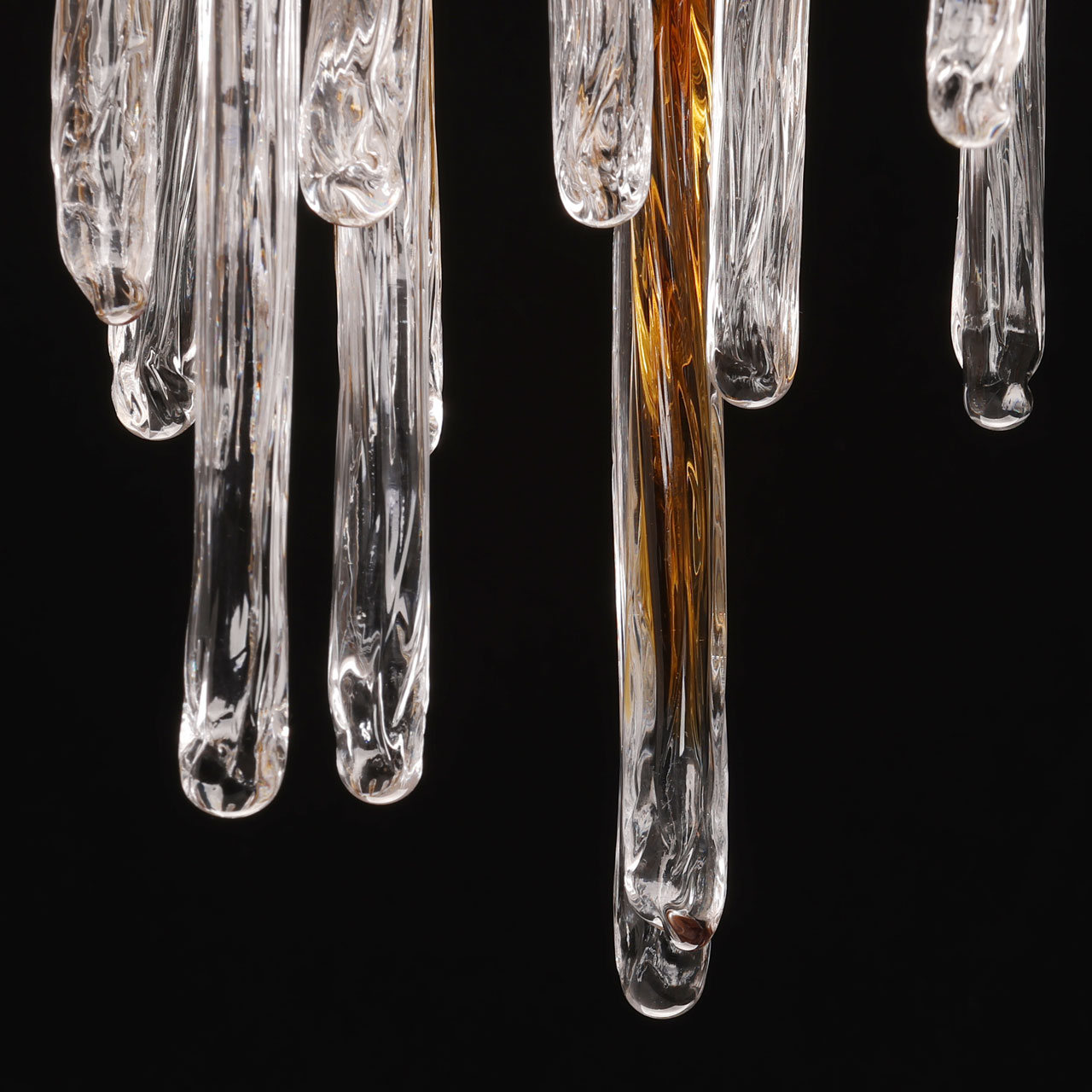 Металлическое основание подвесной люстры окрашено в цвет перламутрового золота. Люстра декорирована прозрачными стеклянными подвесками и подвесками, окрашенными в цвет карамели.