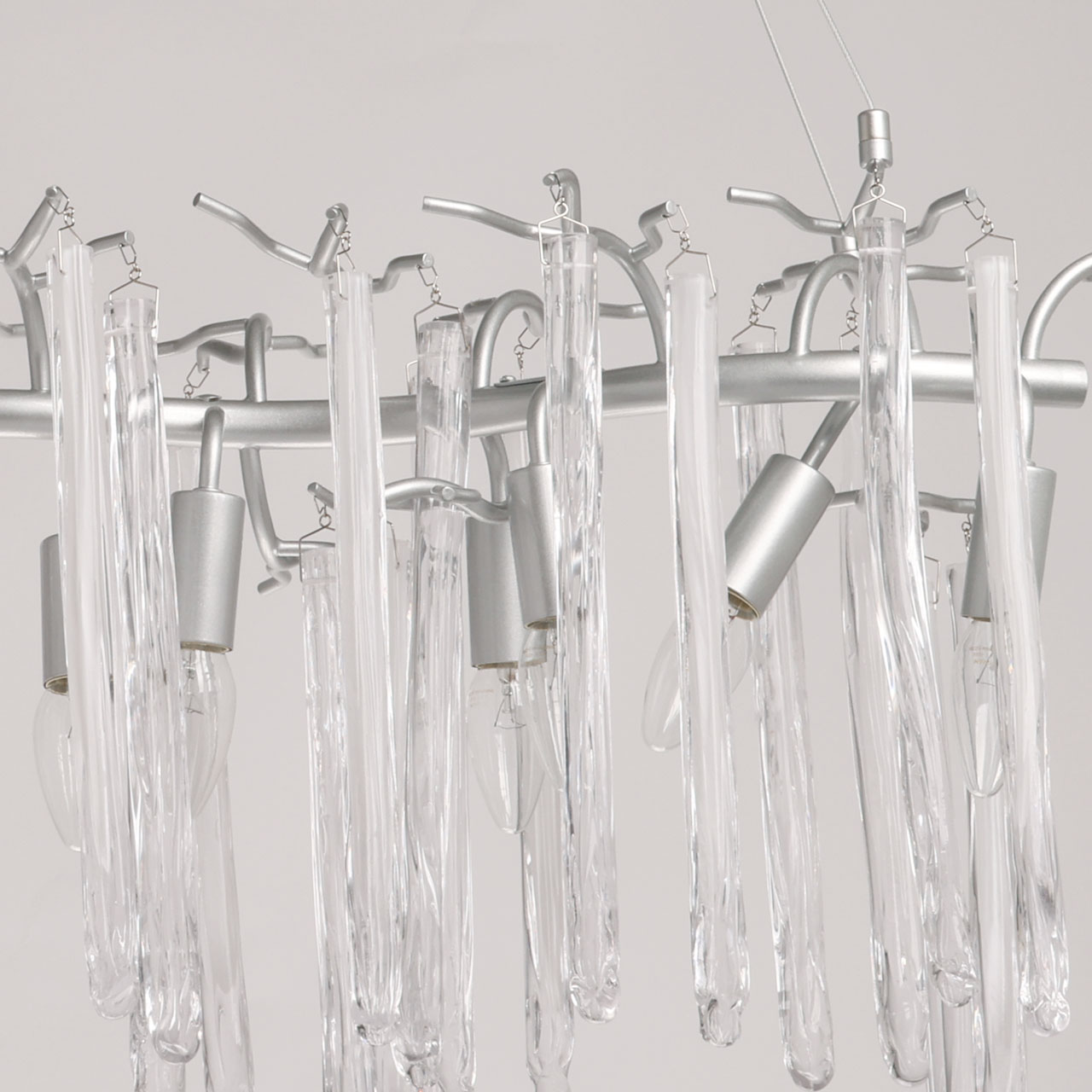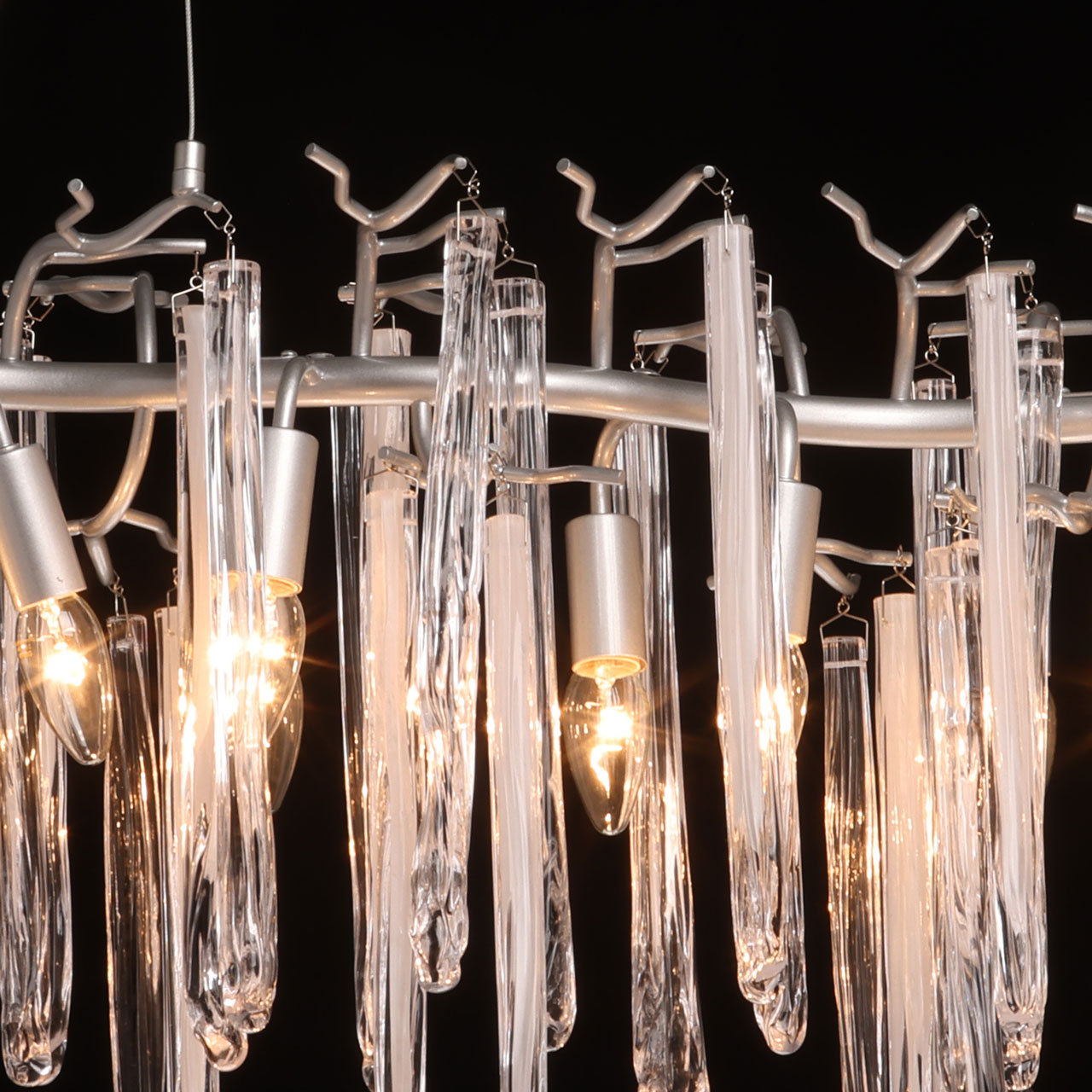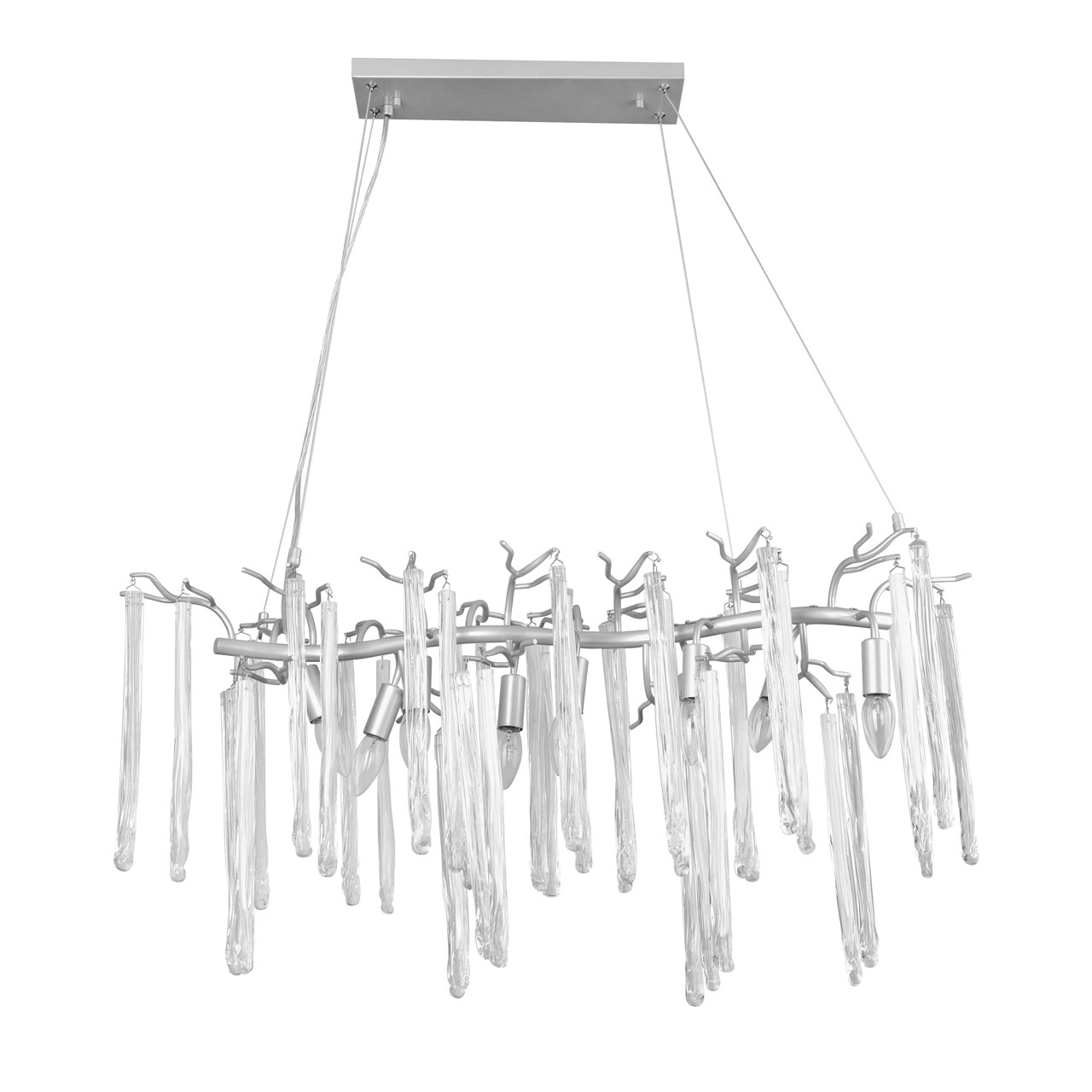 Металлическое основание подвесной люстры окрашено в цвет перламутрового серебра. Люстра декорирована прозрачными стеклянными подвесками и подвесками, окрашенными в белый цвет.