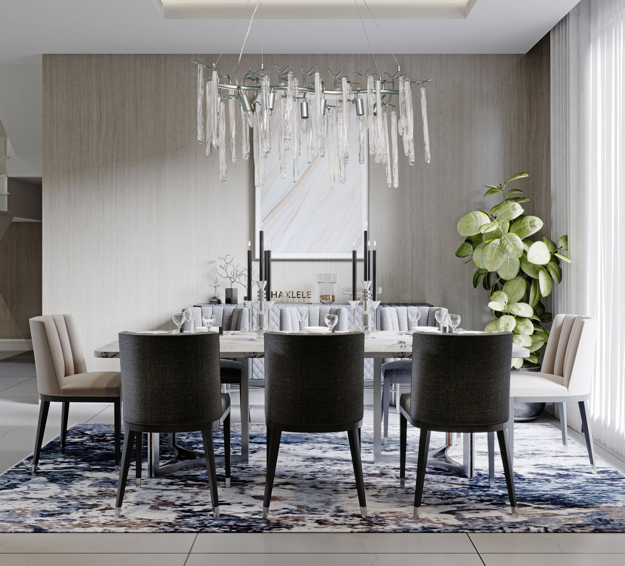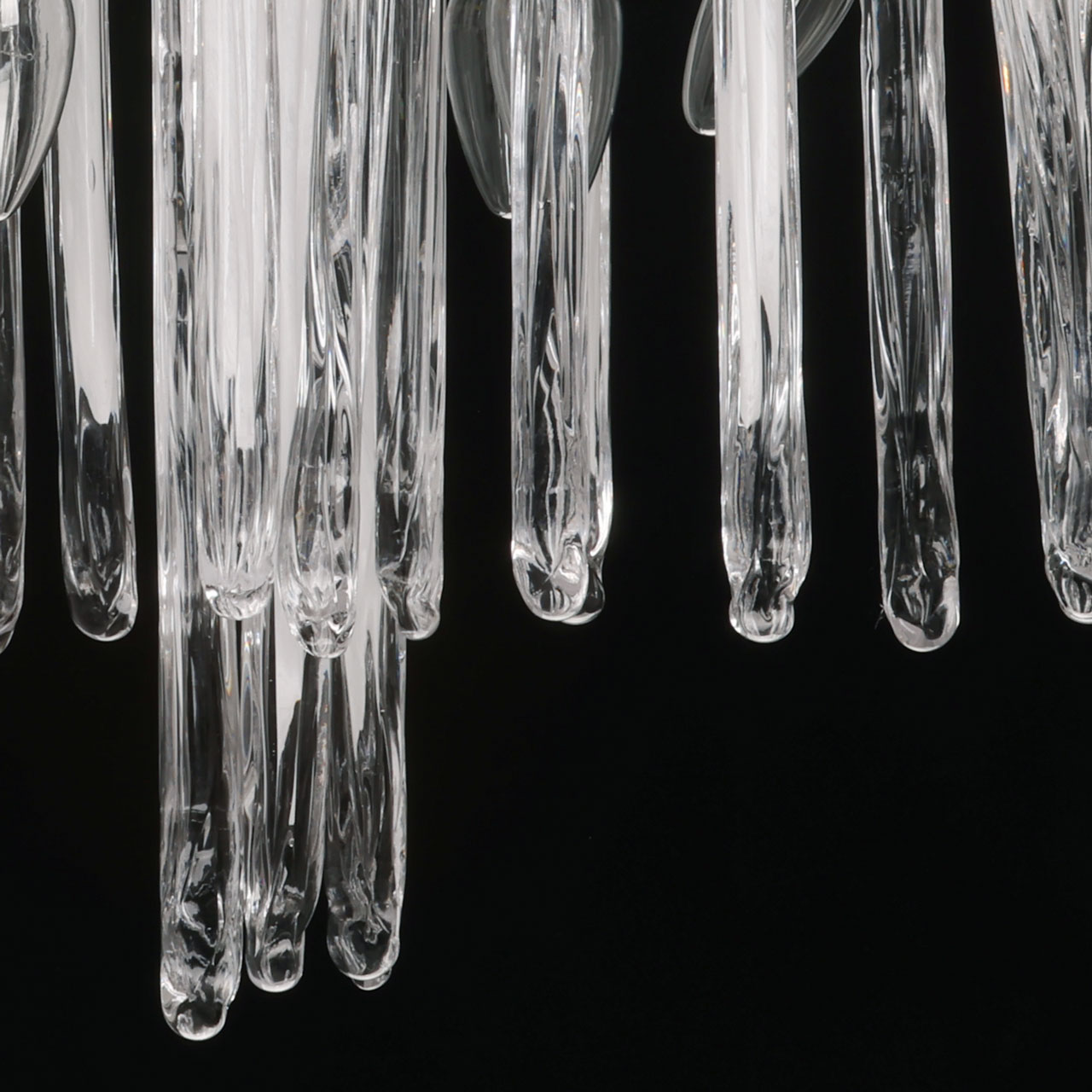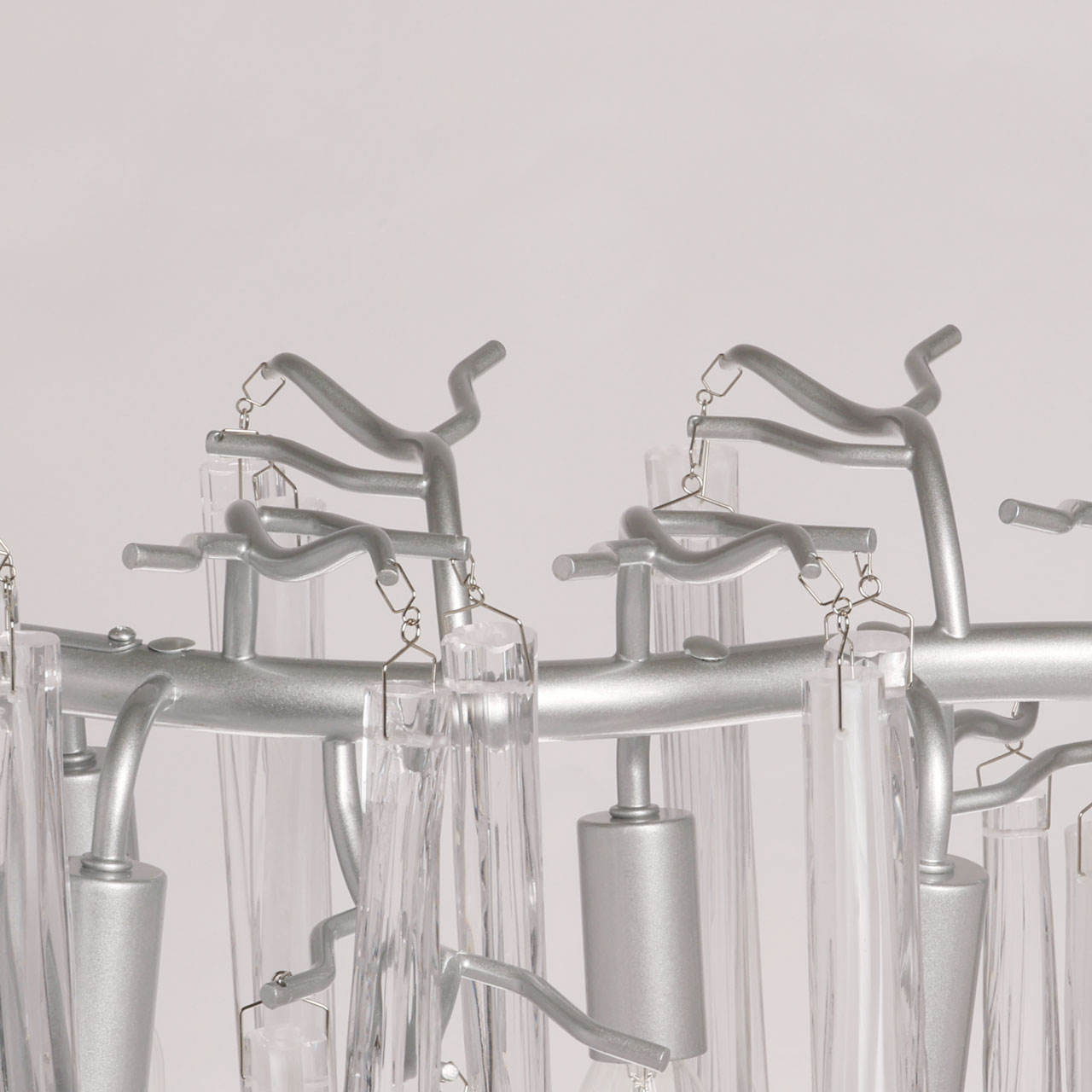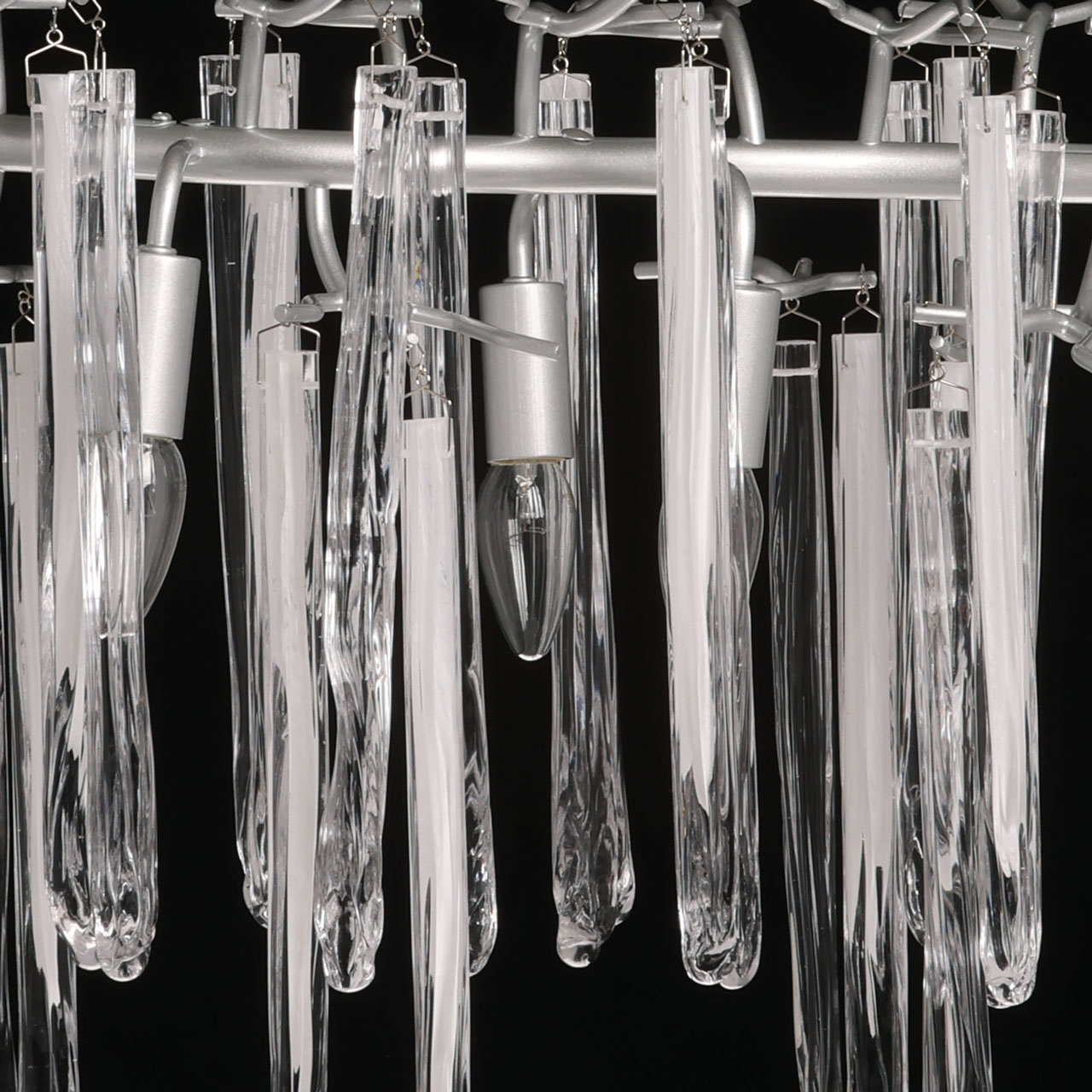 Металлическое основание подвесной люстры окрашено в цвет перламутрового серебра. Люстра декорирована прозрачными стеклянными подвесками и подвесками, окрашенными в белый цвет.