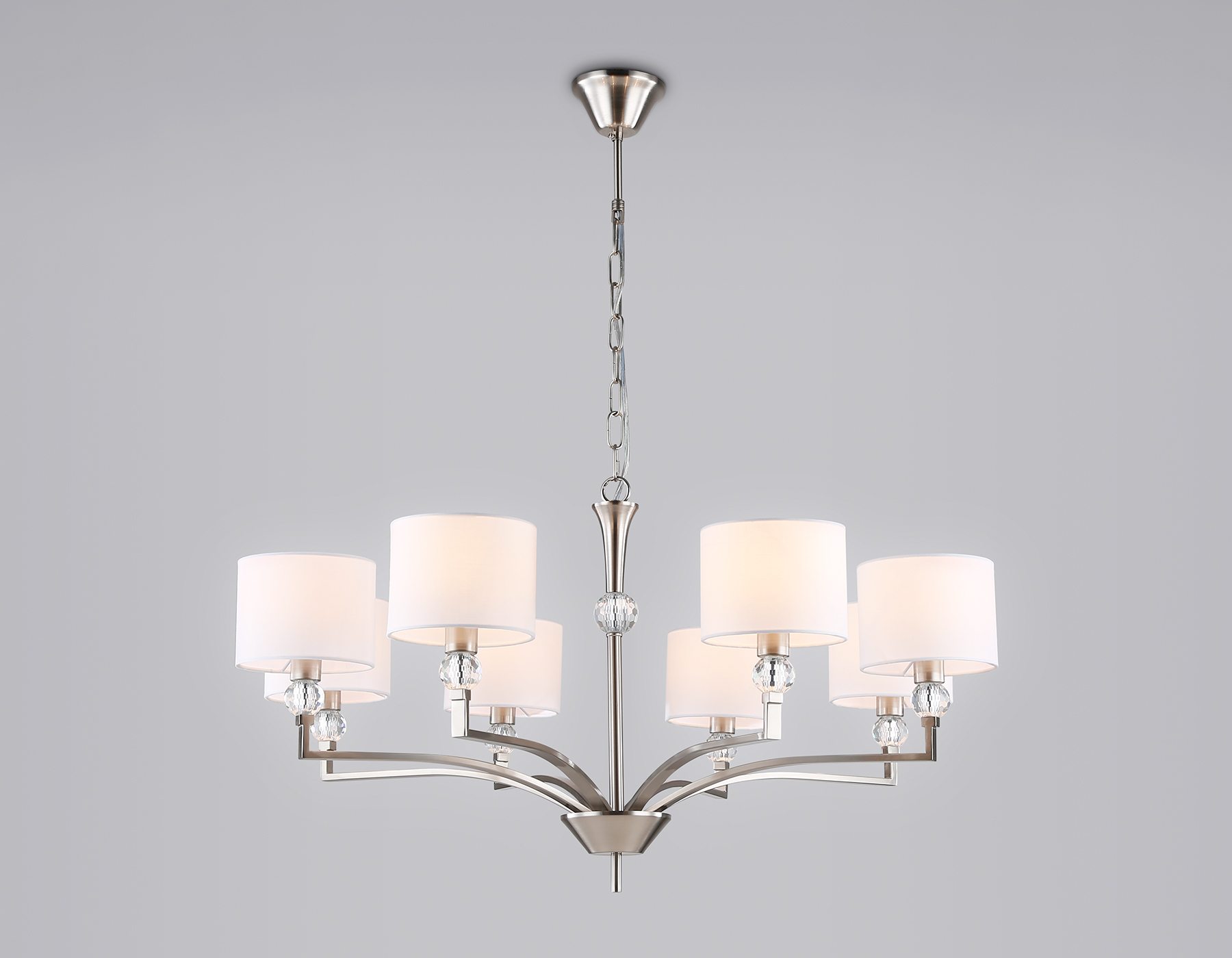 Подвесная люстра с абажурами из коллекции HIGH LIGHT. Модель LH71123 представлена в классическом стиле. Люстра выполнена из тканевых плафонов белого цвета и декорирована превосходным прозрачным хрусталем, каркас изготовлен из металла цвета никель. Для данной модели подойдут лампы с цоколем Е14. Люстра будет прекрасным дополнением в любом помещении.