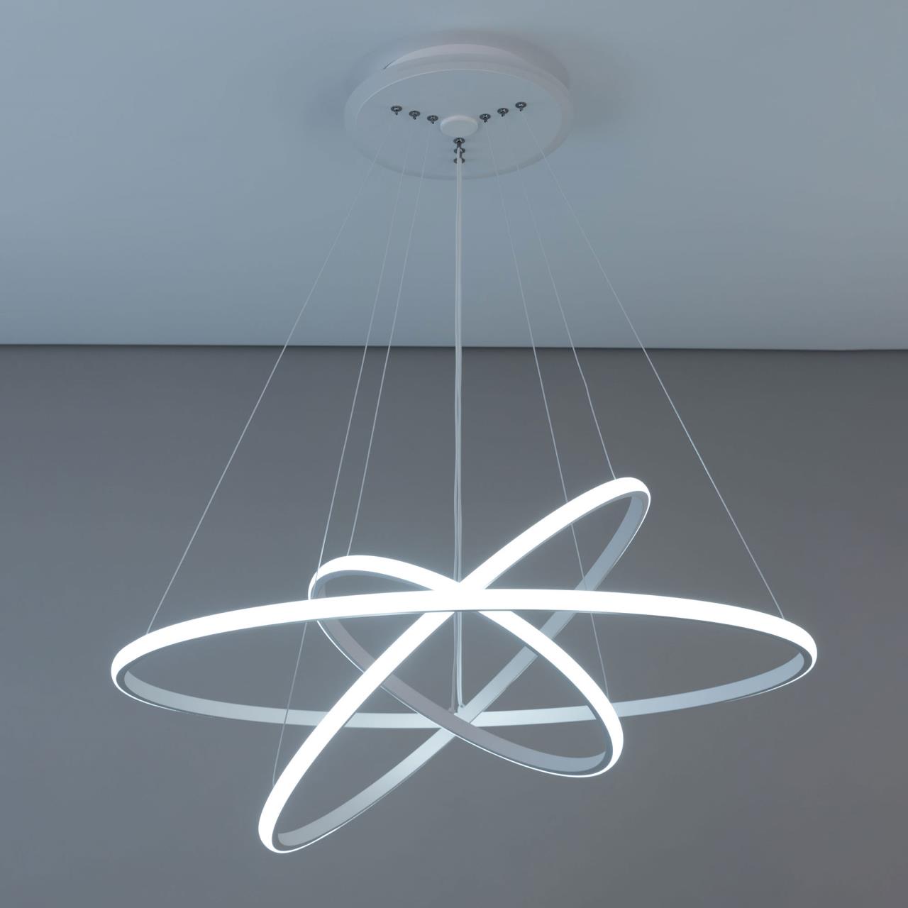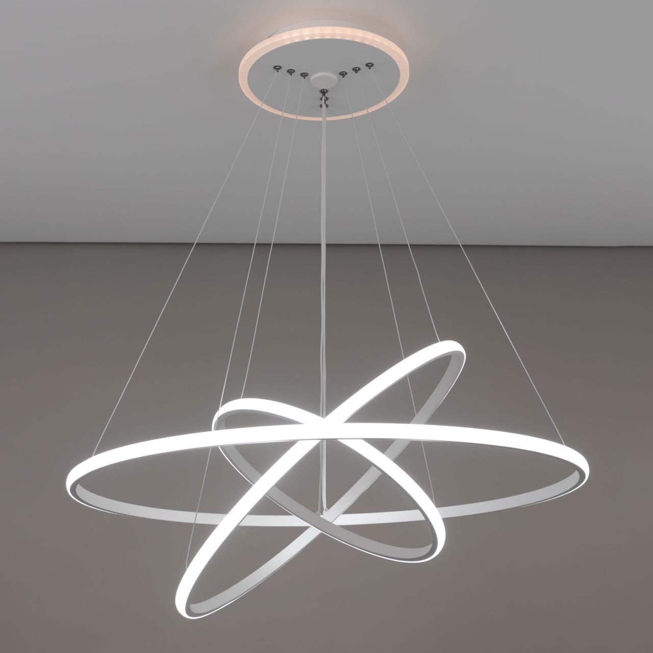 Подвесная светодиодная люстра CL731A090E от производителя Citilux относится к коллекции Неон Смарт с голосовым управлением, входит в экосистему Citilux SMART. Светильником можно управлять: из приложения на смартфоне по Wi-Fi, при наличии интернета, с помощью голосовых помощников Алиса и Маруся, а также пультом дистанционного управления и настенным выключателем. Люстра на тросах, в форме каскада из трех подвесных колец, высоту и угол наклона каждого из которых можно изменить. Корпус изготовлен из алюминиевого сплава, окрашенного в белый цвет. Рассеиватель оптический полимер, цвет белый матовый. Крепление люстры подходит для всех типов потолков, в том числе натяжных. Тип крепления – планка. Модель оснащена мощными светодиодами, с возможностью плавной регулировки яркости от 10 до 100%. Цветовая температура регулируется в диапазоне от 3000К до 5500К, с возможностью настроить любые оттенки теплого, нейтрального и холодного света. В основании светильника установлена независимая цветная подсветка RGB. Мощность изделия 110Вт, световой поток 6800Лм, площадь освещения до 21м² . страна бренда Дания.Купить модель CL731A090E спешите в интернет-магазине 220svet.