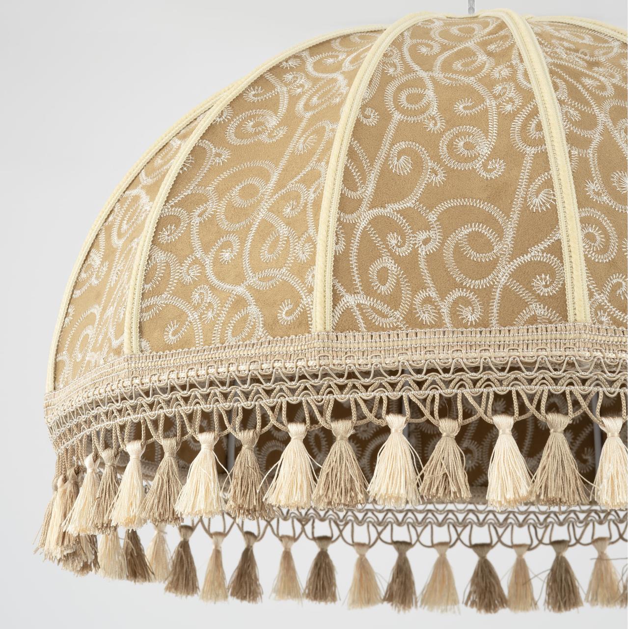 Уютный подвесной светильник Citilux Базель CL407025 выполнен в классическом стиле. Потолочное основание металлическое, молочного цвета с благородной золотистой патиной, украшено искусным орнаментом. Абажур тканевый, цвета капучино декорирован оригинальной вышивкой и обшит бахромой.