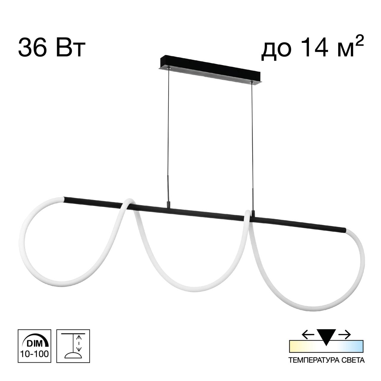 Мощность изделия 36Вт, световой поток 3600Лм, индекс цветопередачи CRI >80. Длина модели 115см, высота легко регулируется при установке в диапазоне от 50см до 1,5м.