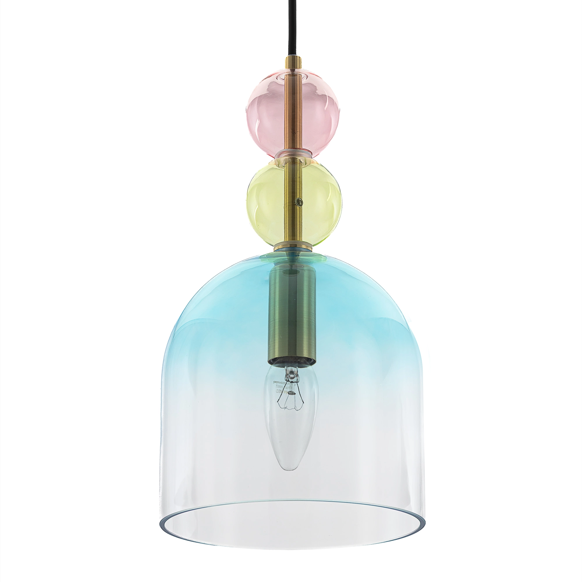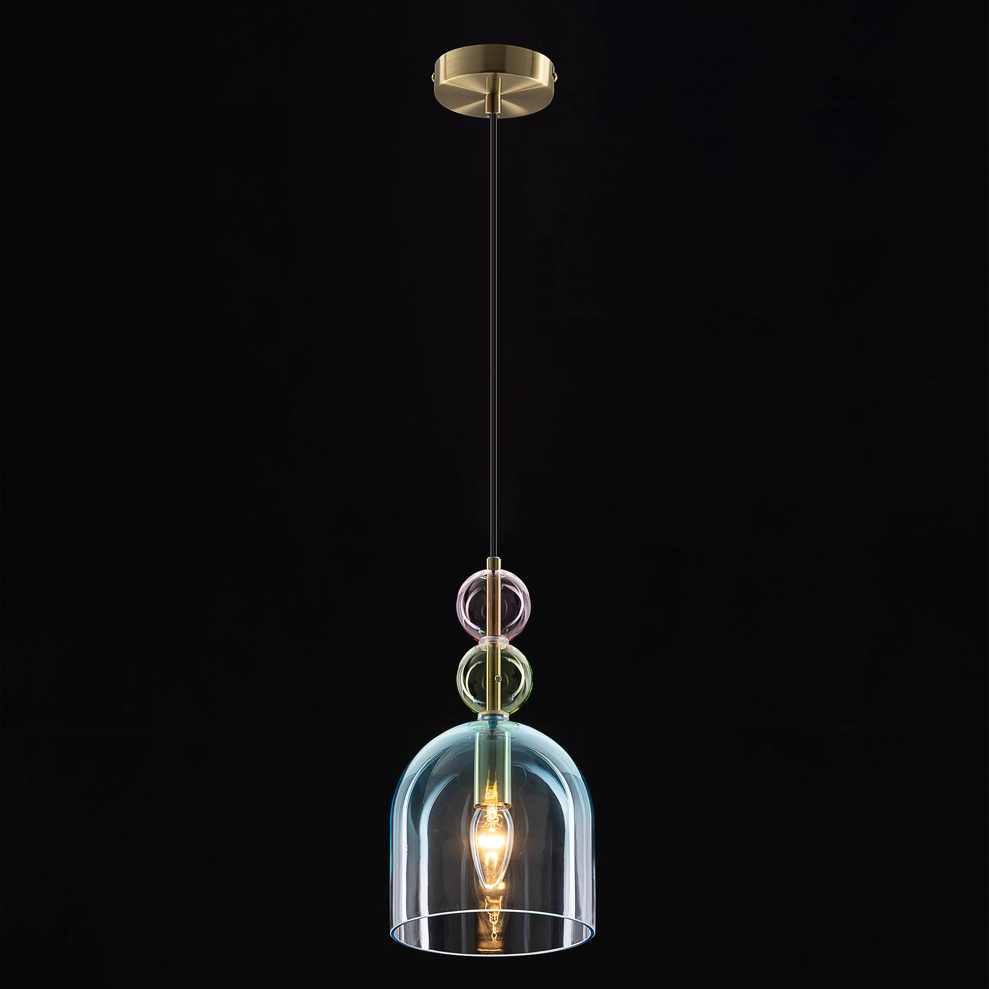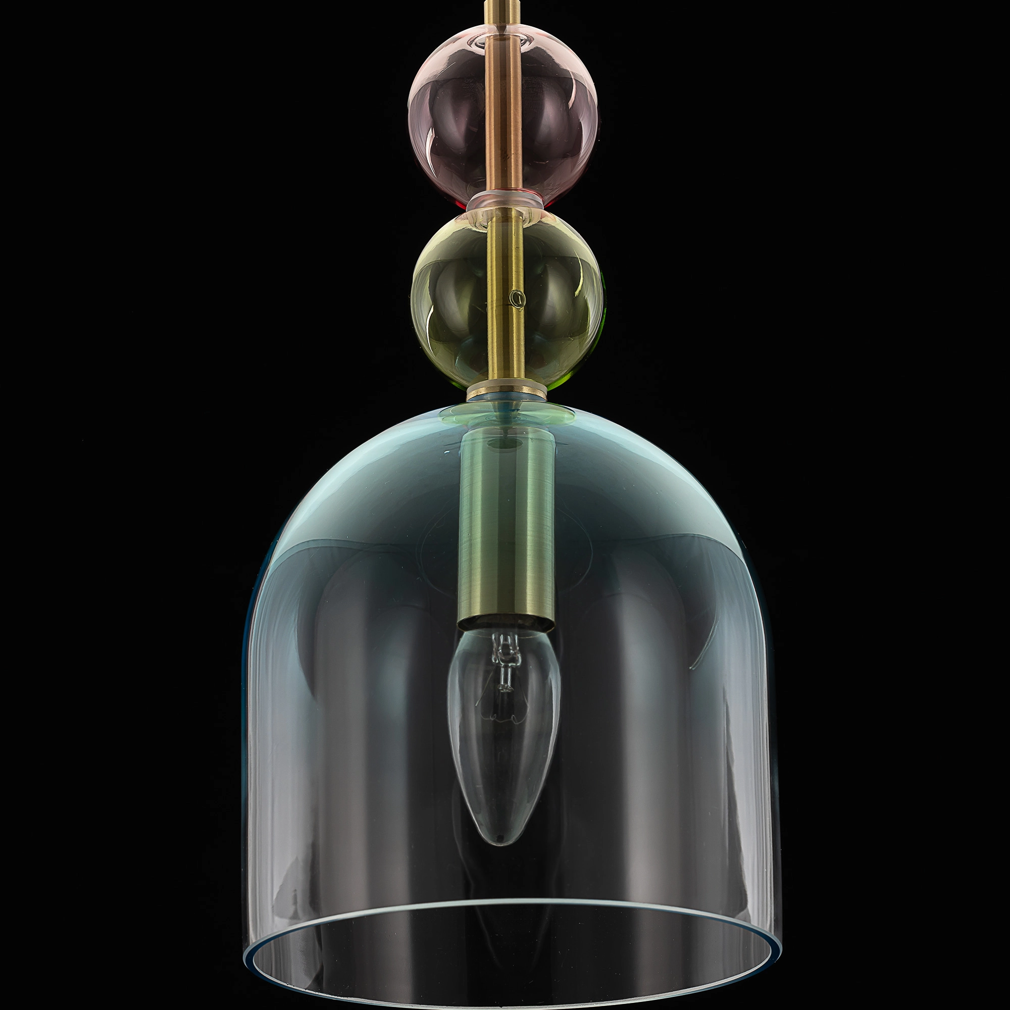 Основание светильника из металлического сплава, стильного оттенка латунь. Изящный плафон и декор — из прозрачного стекла с разноцветной тонировкой: розовой, зеленой и дымчатой. Оригинальное сочетание оттенков создает модный и комфортный свет.