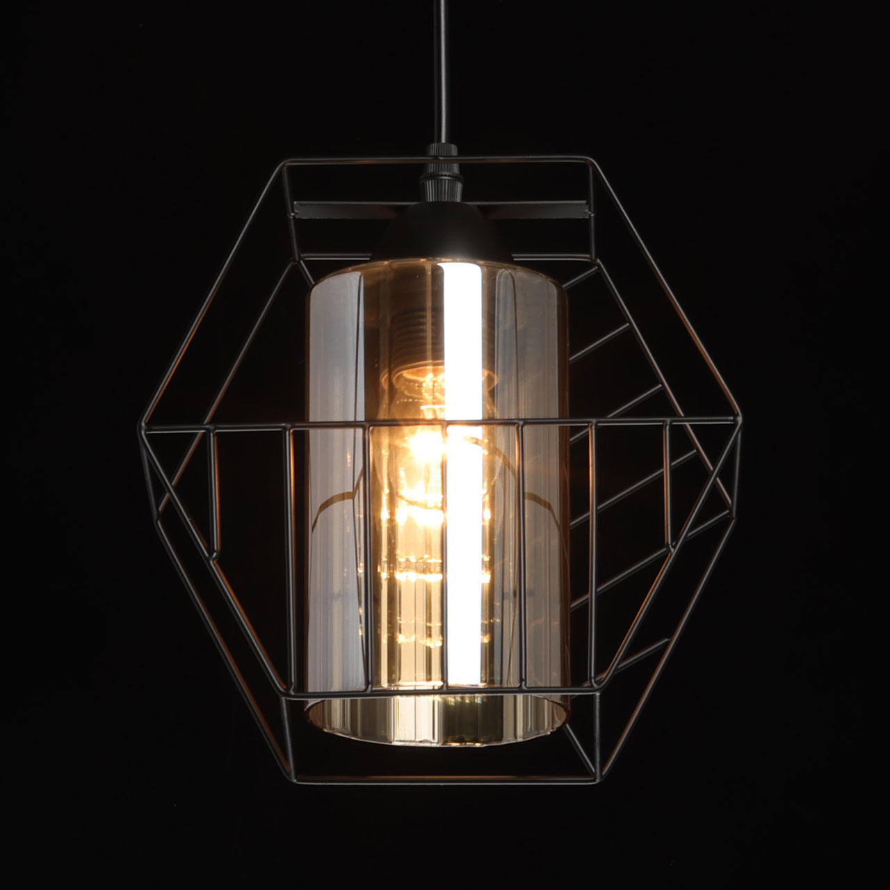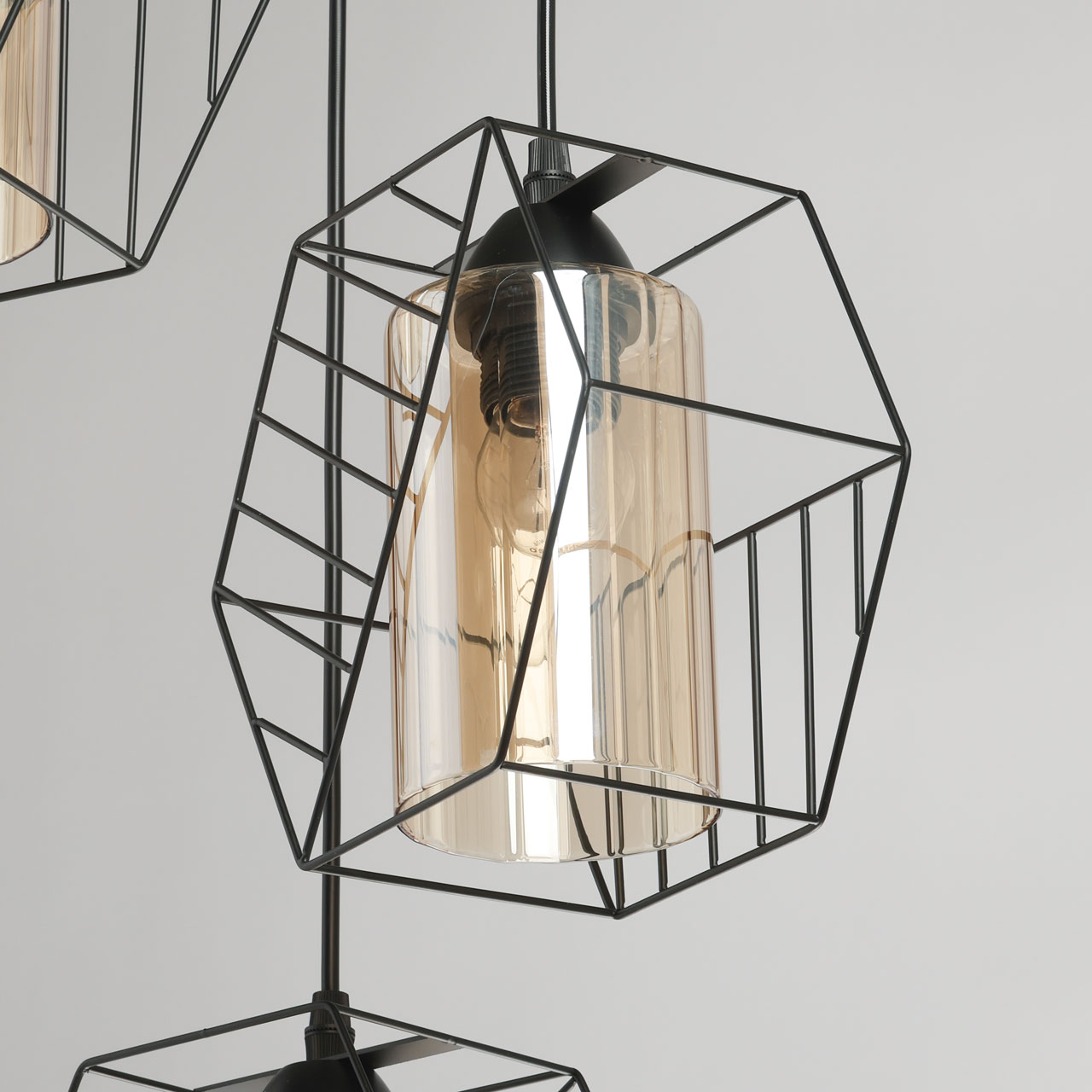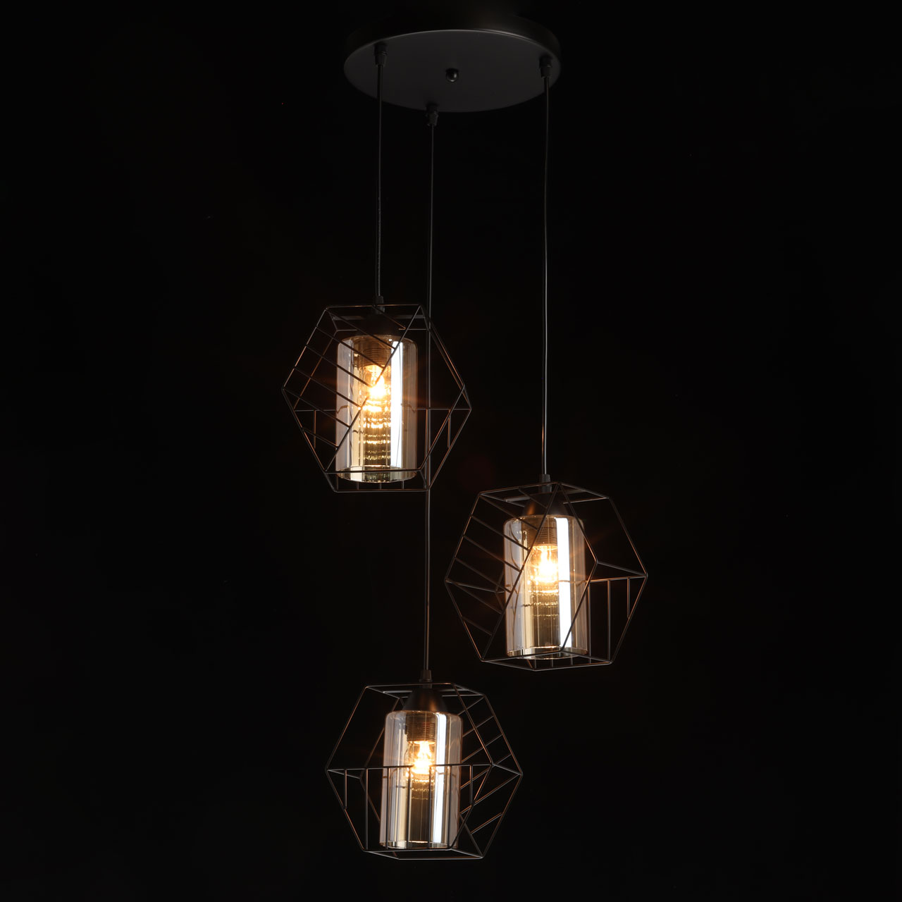 Металлическое основание люстры с тремя подвесами окрашено в черный цвет. Источники света закрыты двойными плафонами. Внешний плафон геометричной формы выполнен из металла и окрашен в цвет основания. Внутренний плафон отлит из стекла, гальванизированного в цвет шампань.