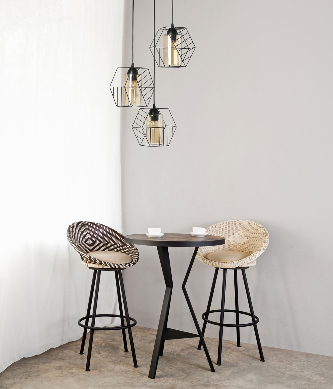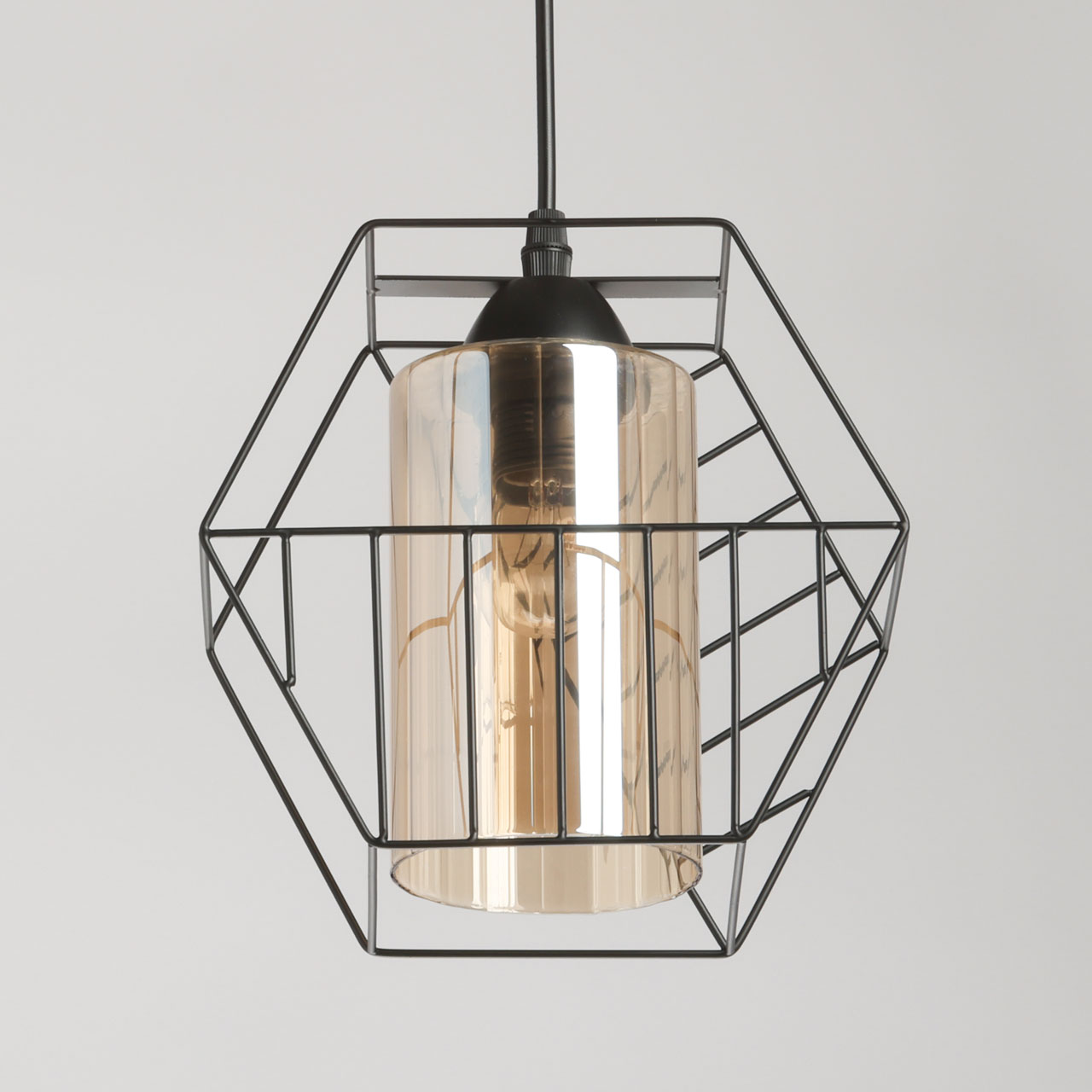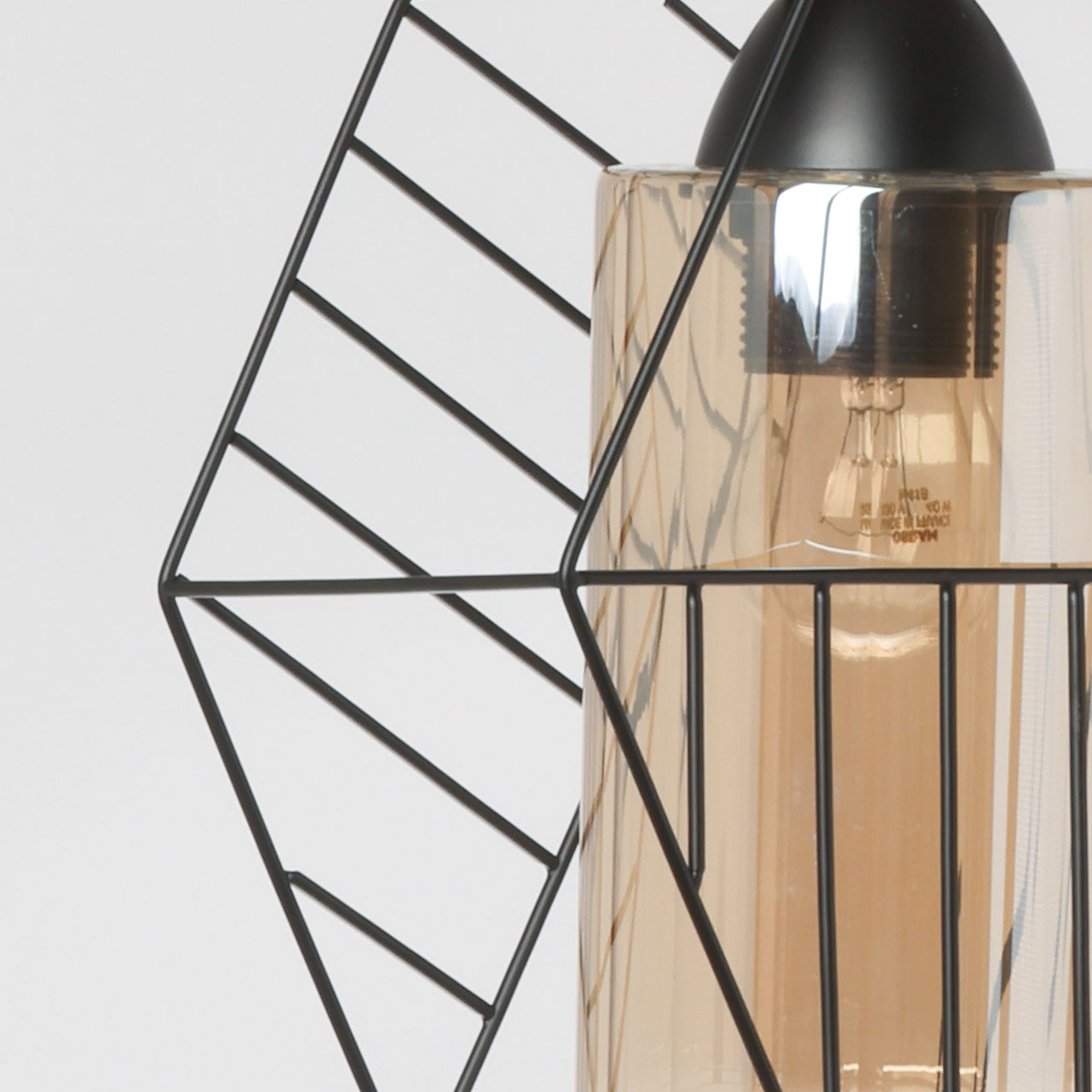 Металлическое основание люстры с тремя подвесами окрашено в черный цвет. Источники света закрыты двойными плафонами. Внешний плафон геометричной формы выполнен из металла и окрашен в цвет основания. Внутренний плафон отлит из стекла, гальванизированного в цвет шампань.