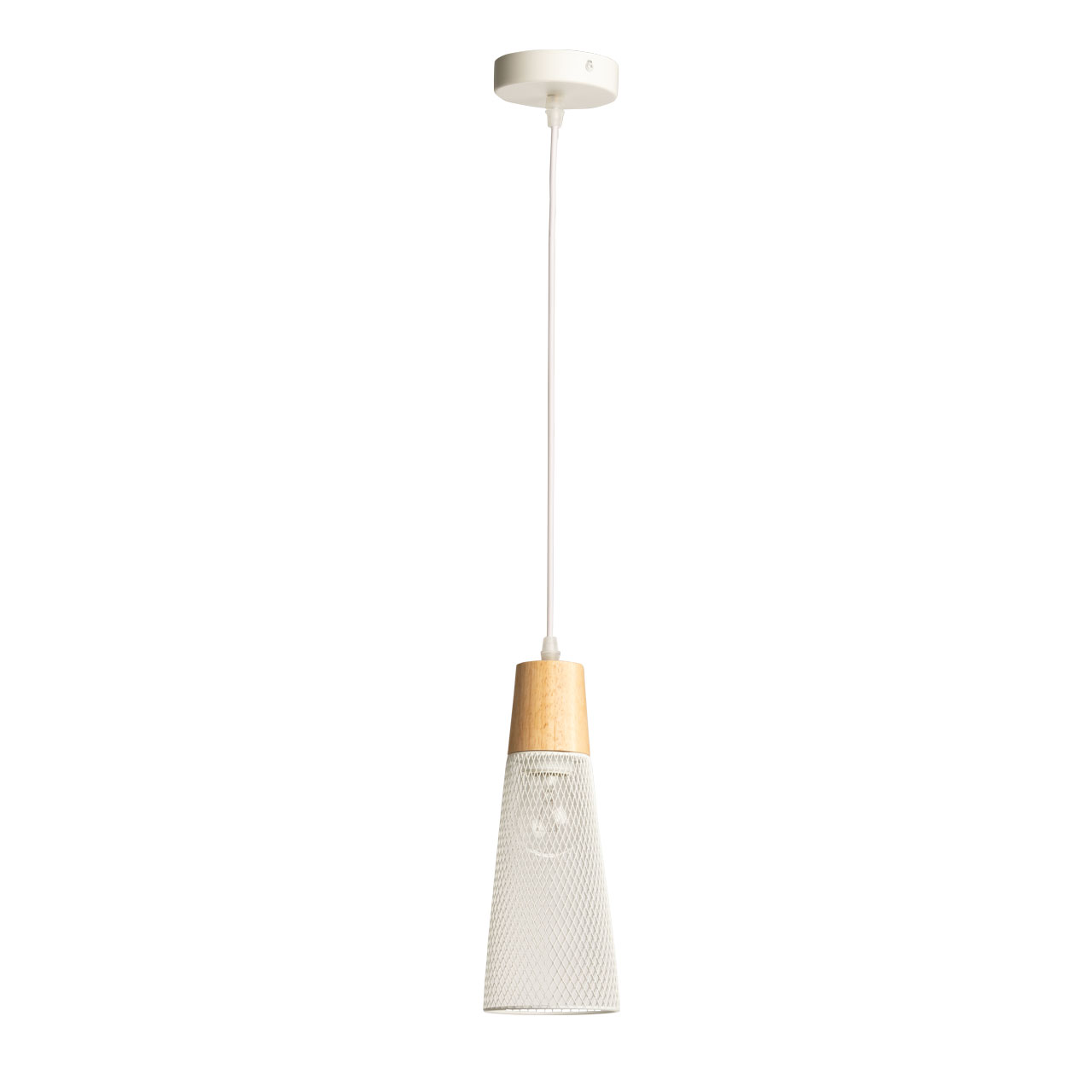 Металлическое основание и плафон подвесного светильника окрашены в белый цвет. Декоративный элемент на подвесе выполнен из металла с имитацией под натуральное дерево.