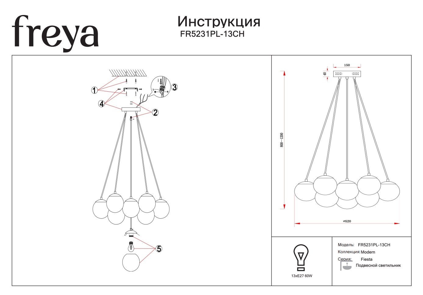 Осветительный прибор Fiesta FR5231PL-13CH оснащен 13 источниками света с типом цоколя Е27 и мощностью 60 Вт каждая, при этом общая мощность устройства составляет 780 Вт, что позволяет создать комфортное освещение в вашем интерьерном пространстве.