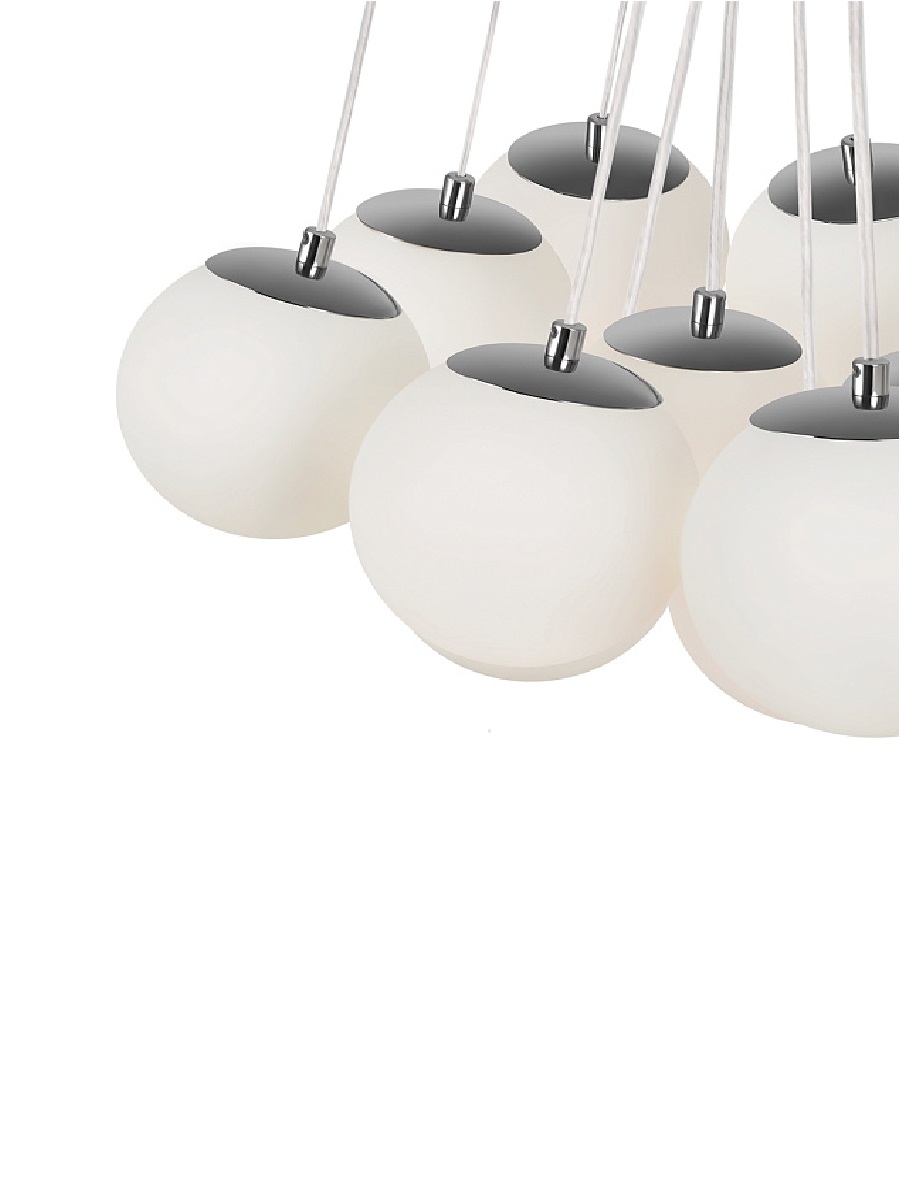 Подвесной светильник выполнен из высококачественных материалов: металлического каркаса в цвете хром и белых стеклянных плафонов, изготовленных в форме шаров и висящих на прозрачных словно невесомых тросах. Благодаря своей компактности и размерам 520 мм х 800 мм, а также регулировке по высоте от 800 мм до 1200 мм, она идеально впишется в любой интерьер и добавит изысканности вашему пространству.