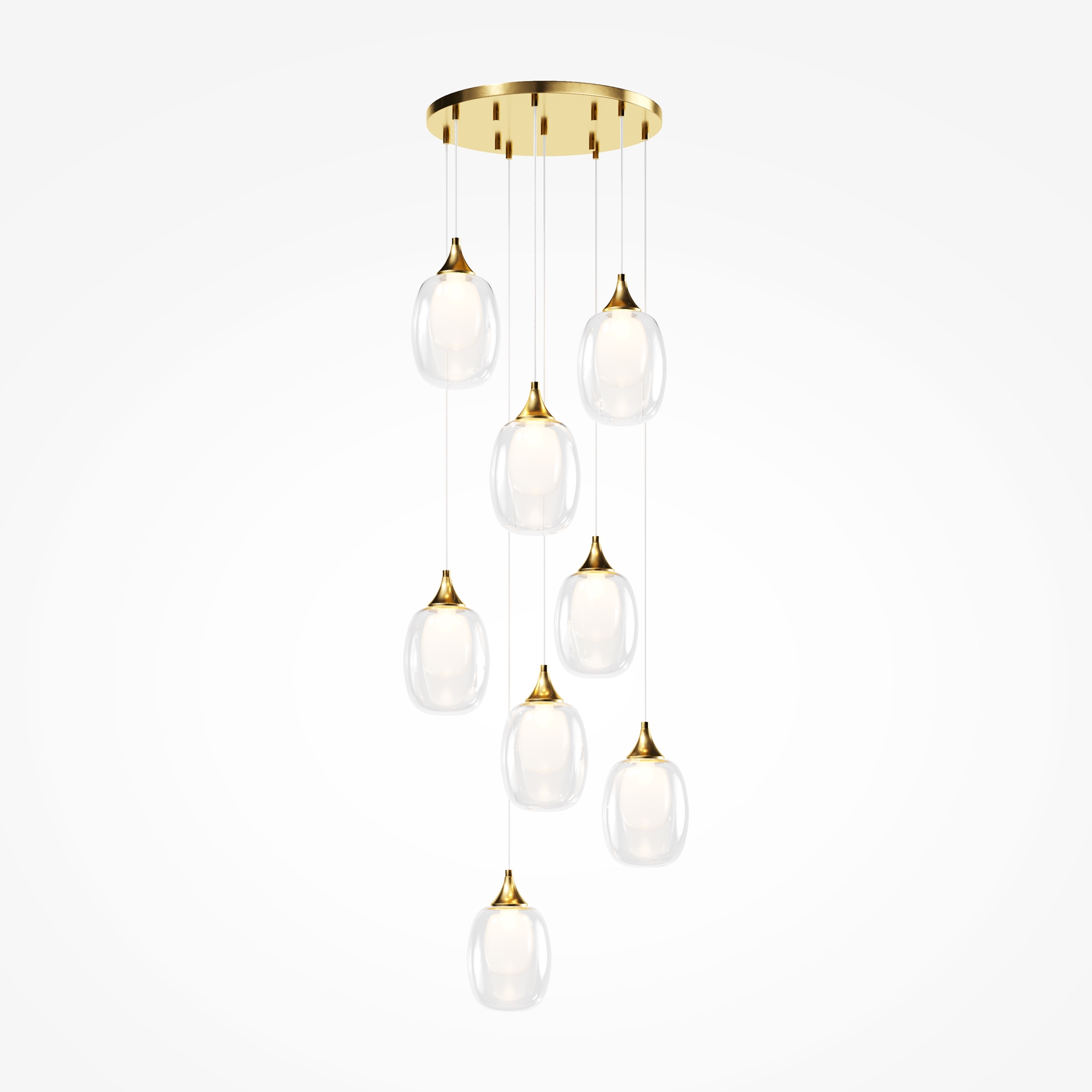 Металлическая арматура, цвет — латунь. Плафоны — двойное выдувное стекло. Внутренняя часть – матовая, внешняя – прозрачная. Элегантная неоклассика, трендовые округлые формы. Прозрачный провод длиной 3 метра подходит для помещений с высокими потолками. Регулируемая высота светильника для удобного размещения.