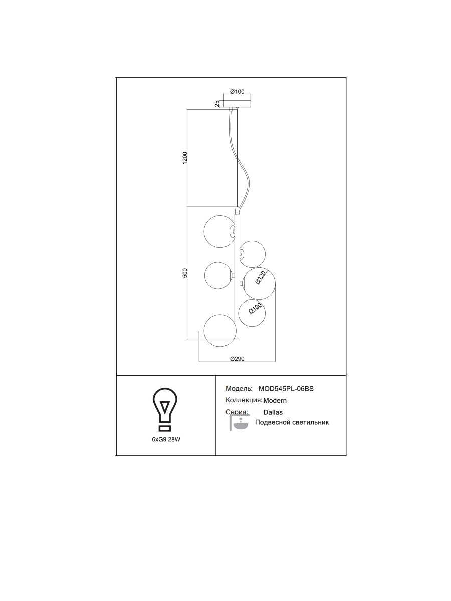 Осветительный прибор Dallas MOD545PL-06BS оснащен 6 источниками света с типом цоколя G9 и мощностью 28 Вт каждая, при этом общая мощность устройства составляет 168 Вт, что позволяет создать комфортное освещение в любом интерьерном пространстве.