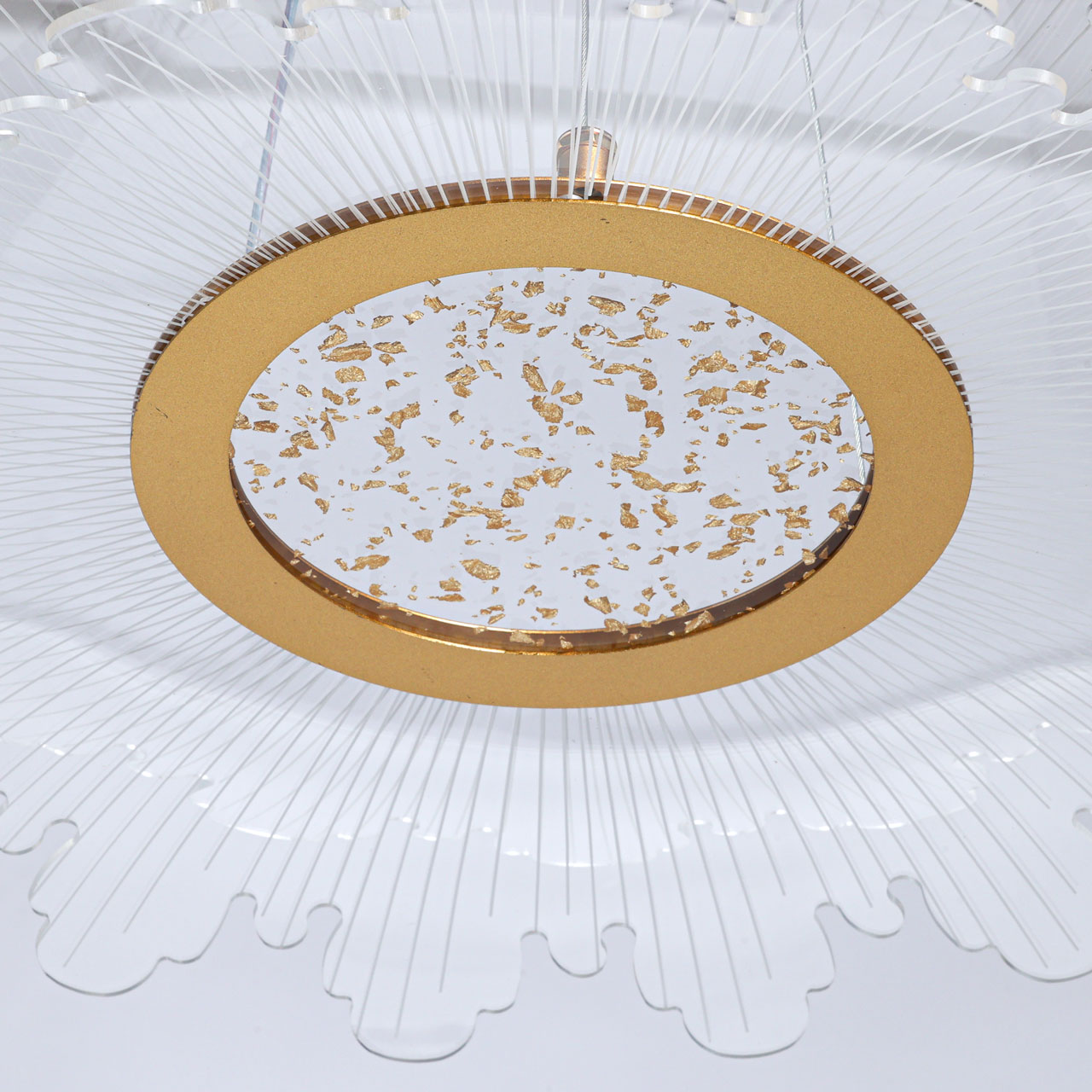 Металлическое основание светильника гальванизировано в цвет золота. Корпус плафона выполнен из сплава алюминия с цинком. Плафон выполнены из прозрачного акрила.