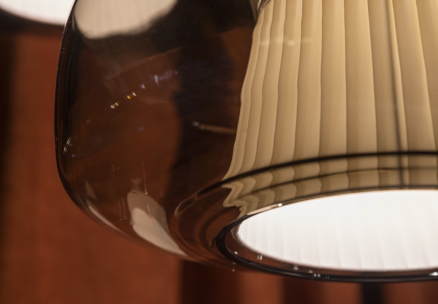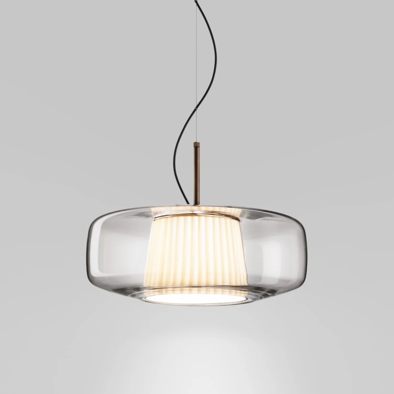 Подвесной светильник Vistosi Plisse SP G Crystal с арматурой матового бронзового цвета. Выдувное стекло диффузора прозрачного цвета скрывает внутренний тканевый абажур и дает жизнь игре прозрачности, цветов и текстур, которые делают Plissè элегантным элементом, способным охарактеризовать и придать индивидуальность помещению, в котором он находится.
