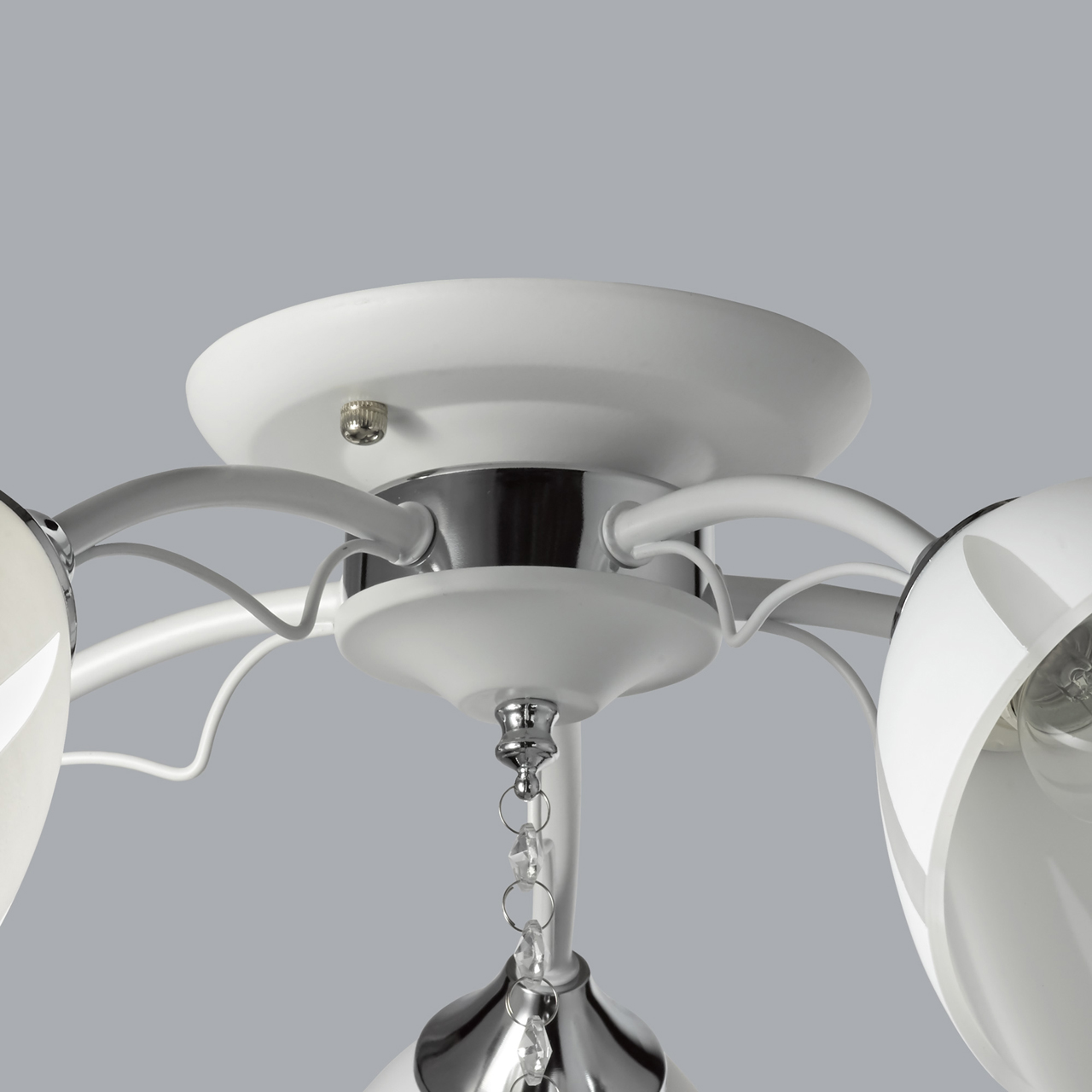 Металлическое основание окрашено в белый, как и изогнутые рожки. Держатели плафонов хромированы, контраст выглядит свежо и органично. Стеклянные плафоны матированы и покрыты белой краской по трафарету. Оригинальный рисунок создает иллюзию сложной формы и объема. Дополнительным декором служит крупный хрустальный шар, завершающий композицию.